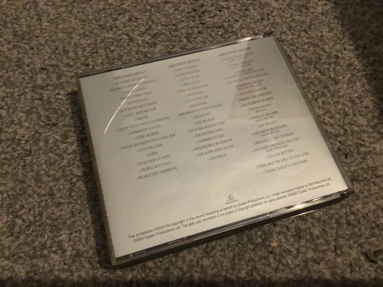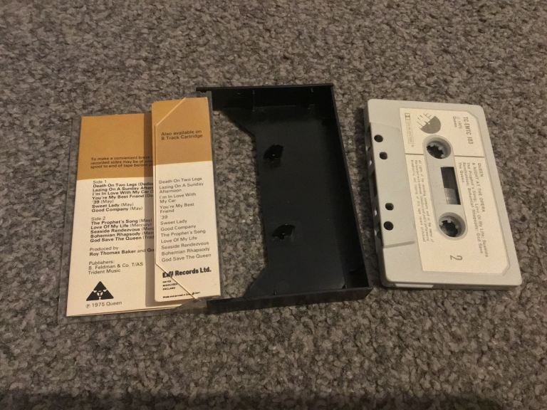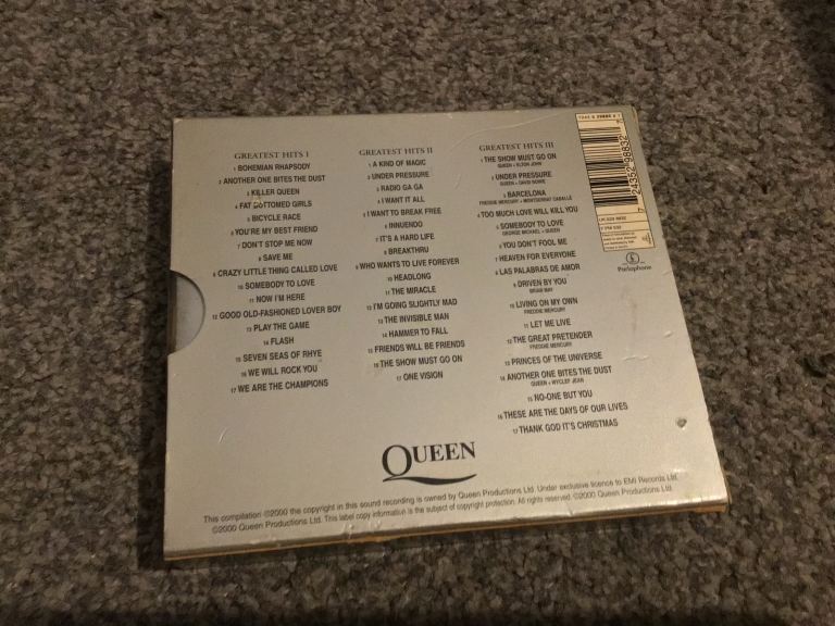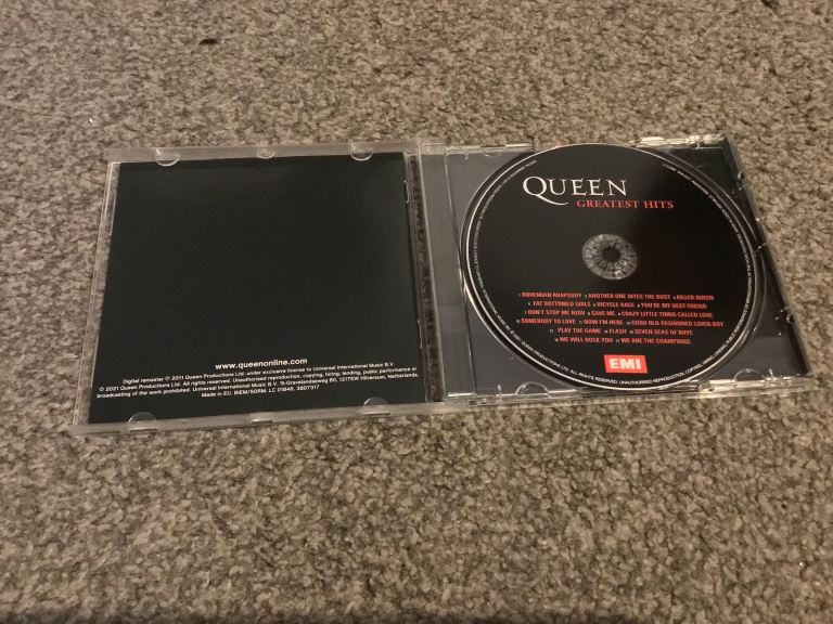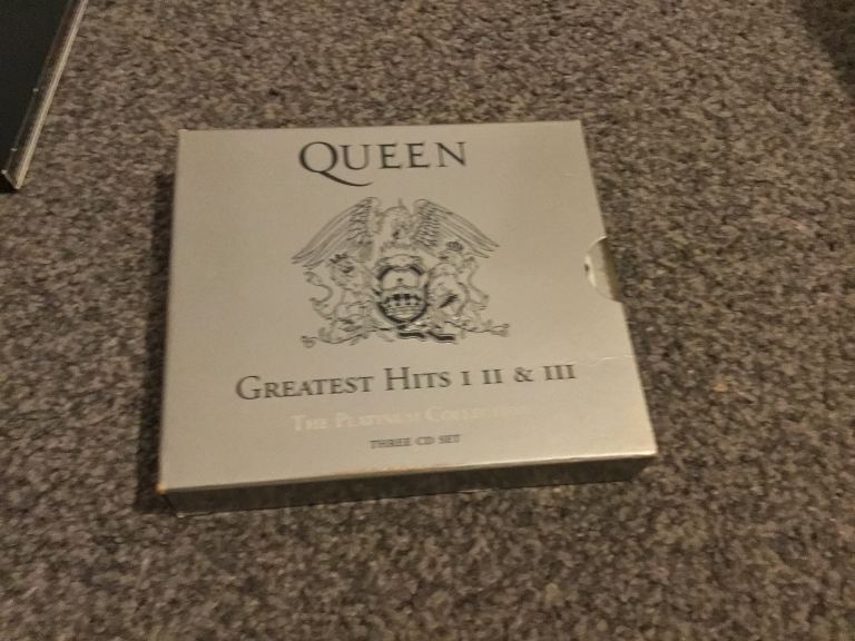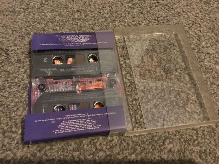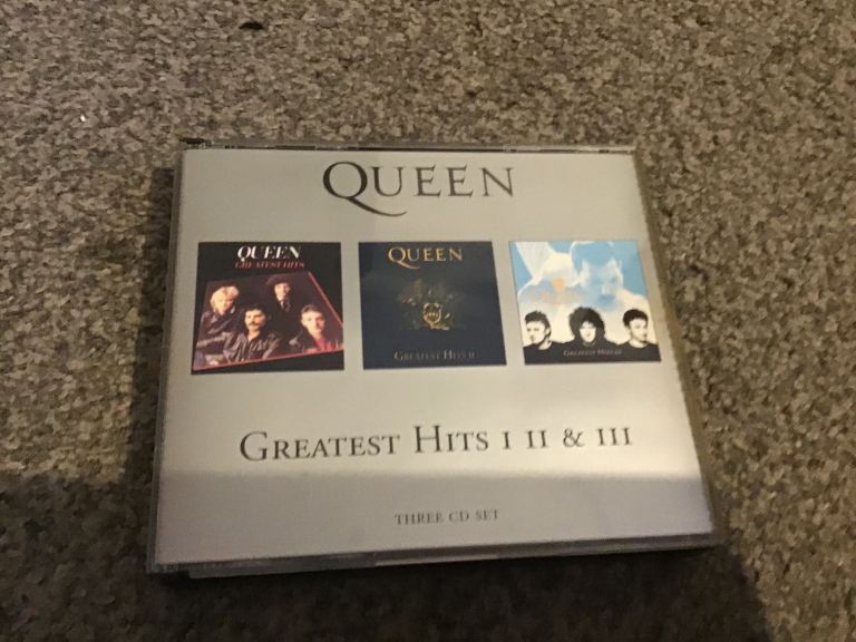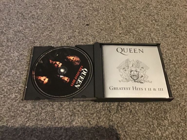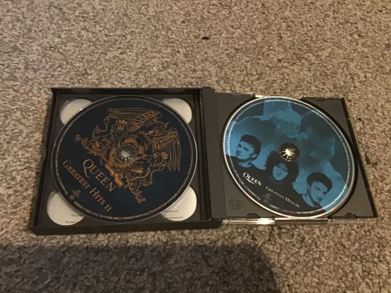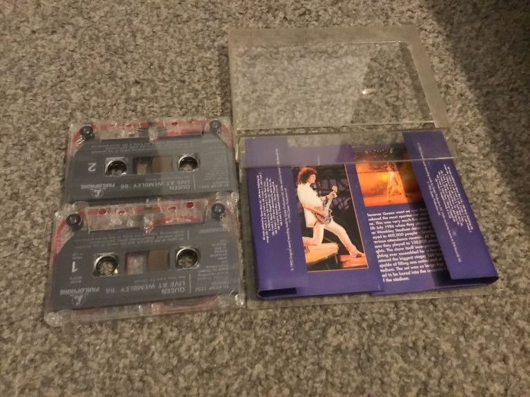 Two Queen cds greatest hits and a night at the opera cassette and a double Queen live at Wembley cassette all In very good condition with no scratches to the cds some wear to the fat box sleeve and general wear to cassette cases