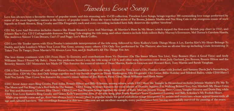 Love has always been a favourite theme of popular music and this stunning 15 CD collection, Timeless Love Songs, brings together 300 outstanding love songs performed by some of the most legendary names in the history of popular music. From the warm ballad styles of Pat Boone, Johnnie Mathis and Nat King Cole to the evergreen music of such legends as Frank Sinatra, Bing Crosby and Ella Fitzgerald, each and every recording included here fully deserves the epithet 'timeless'.