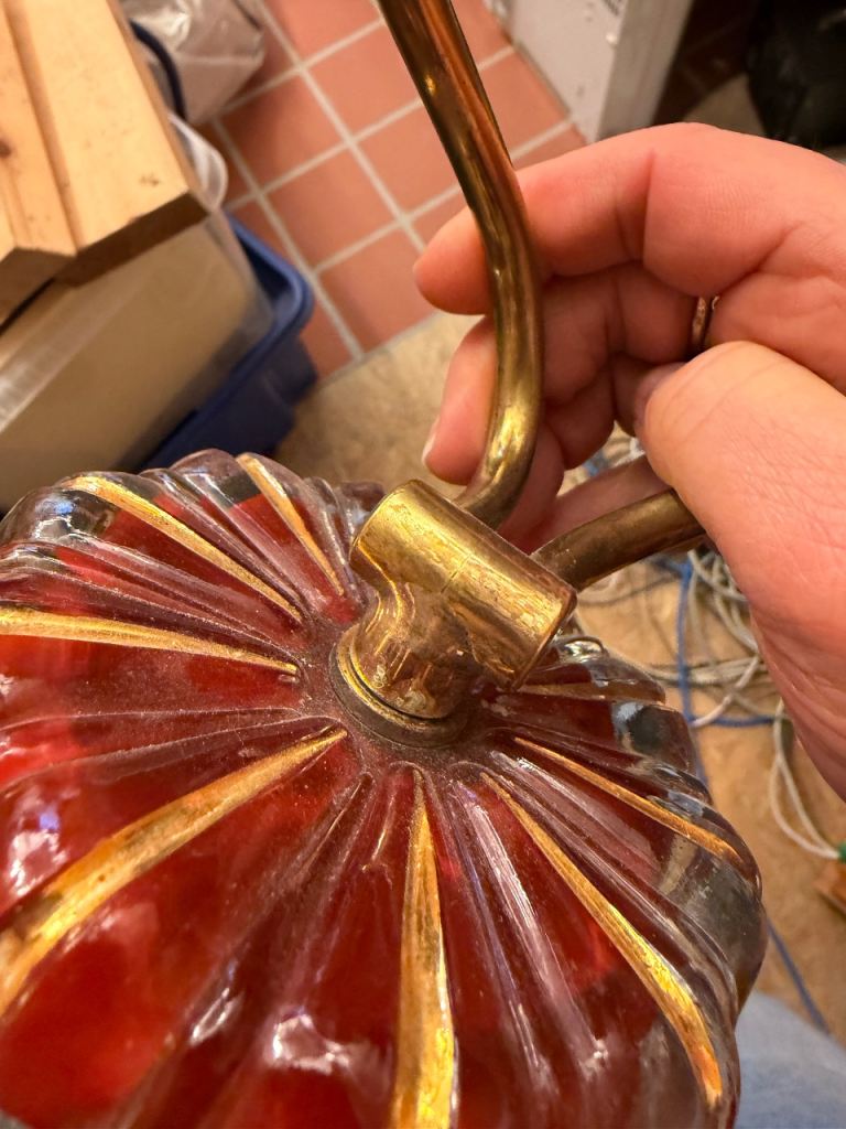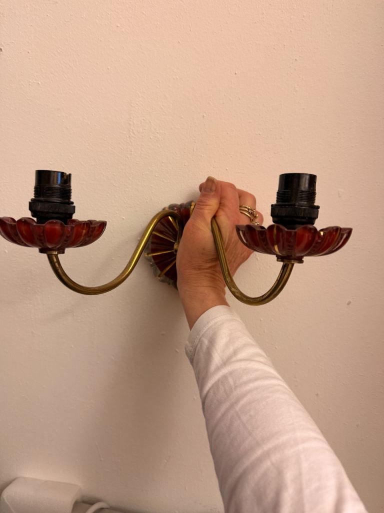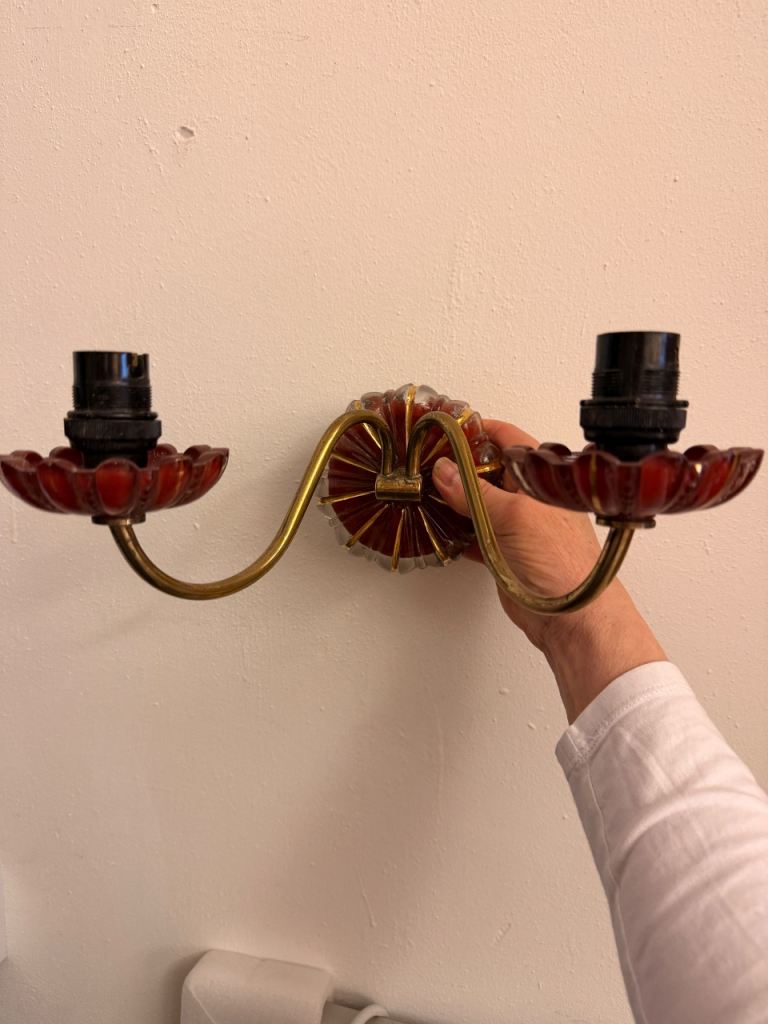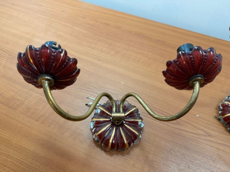 Pair of vintage-style wall sconces with striking red, possibly glass, and brass-coloured metal arms.