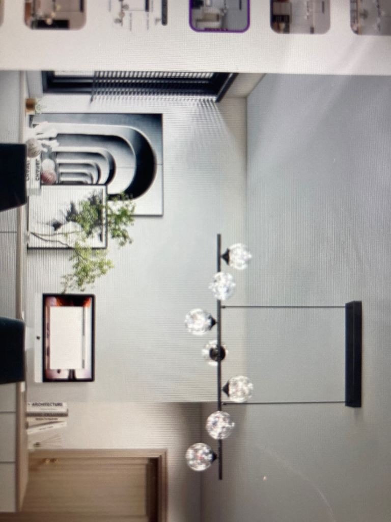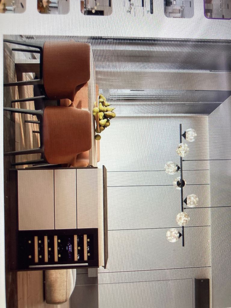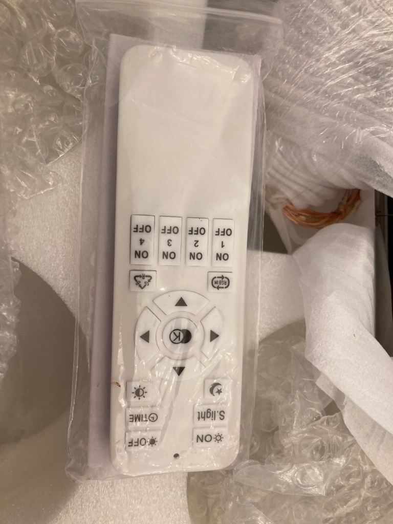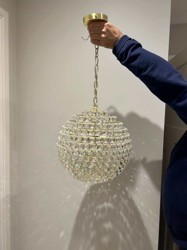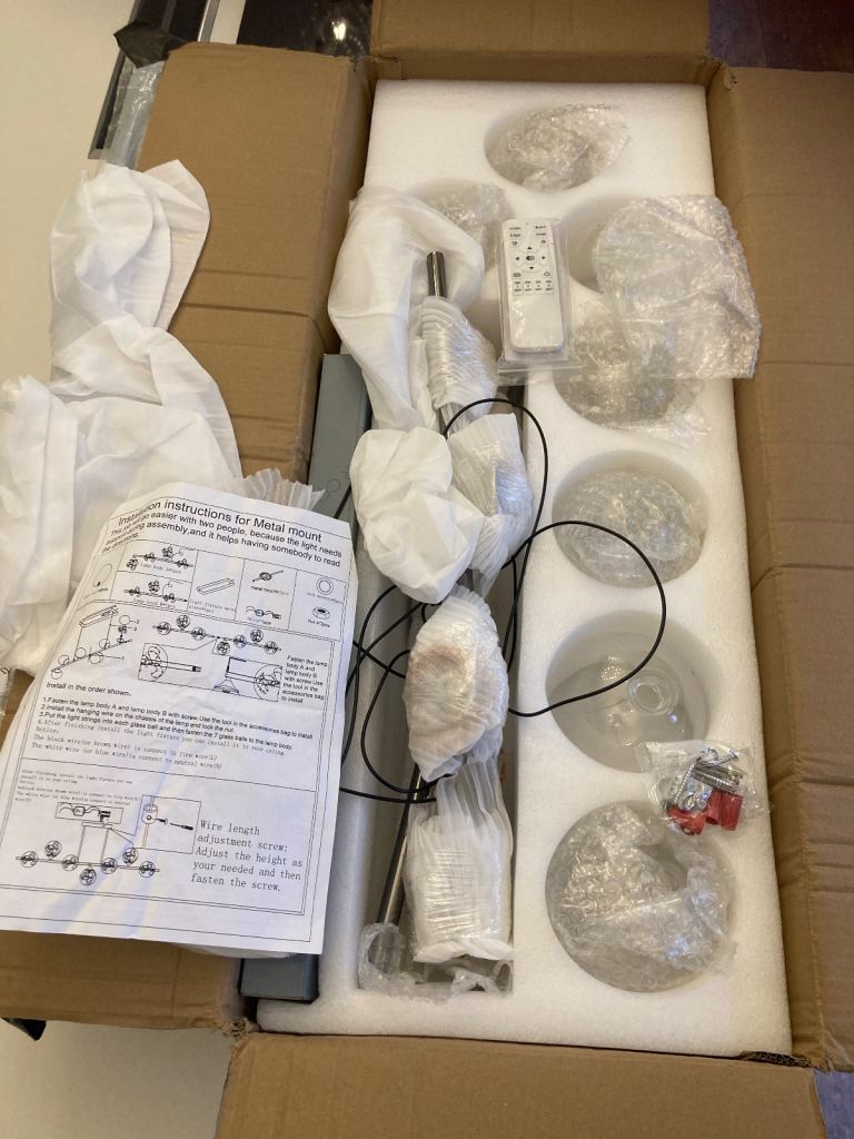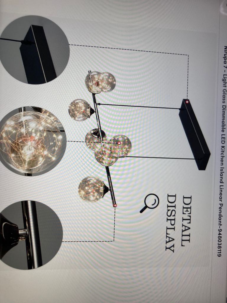 Pendant Kitchen Light (7 bulbs) with hand held dimmer as can be seen in box. Still in original wrappings with instructions. Bought over a year ago but struggling to get electrician to connect in this rural idle. Too old to attempt this myself so will consider reasonable offers.