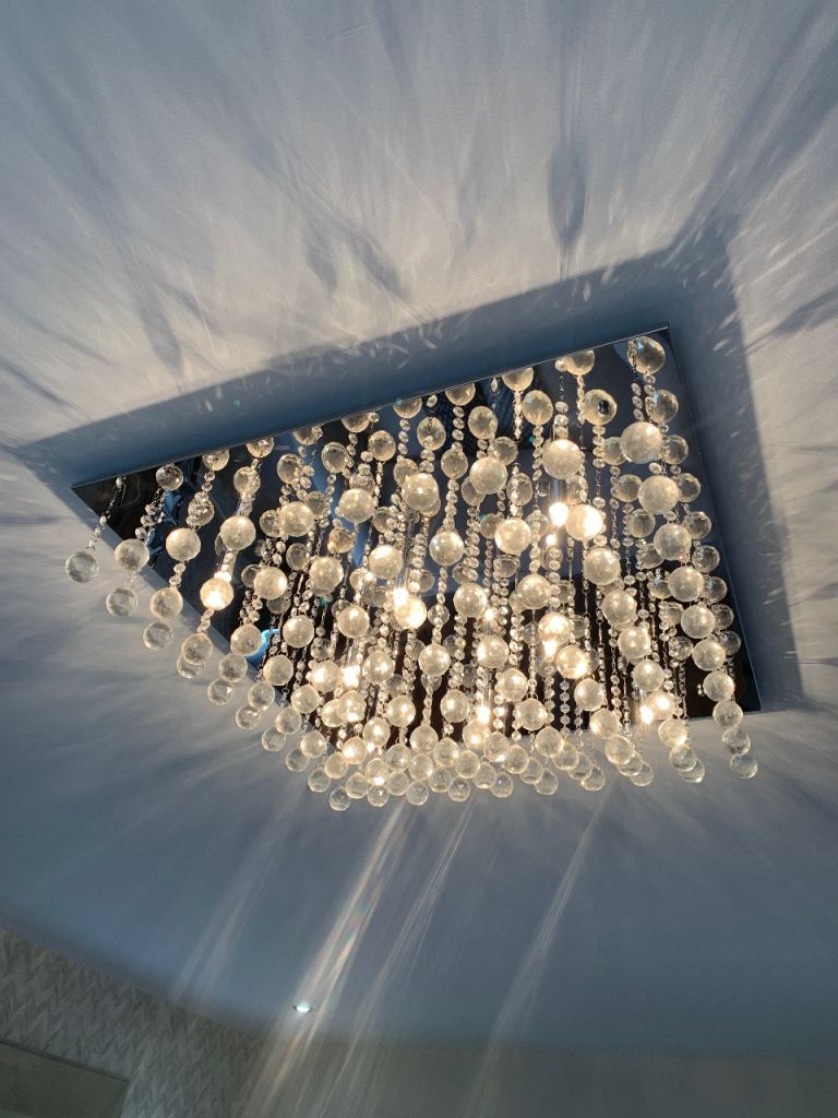Modern 8 light flush ceiling light with chrome finish and square mirrored base. Decorated with faceted crystal balls that create an elegant and bright lighting effect.