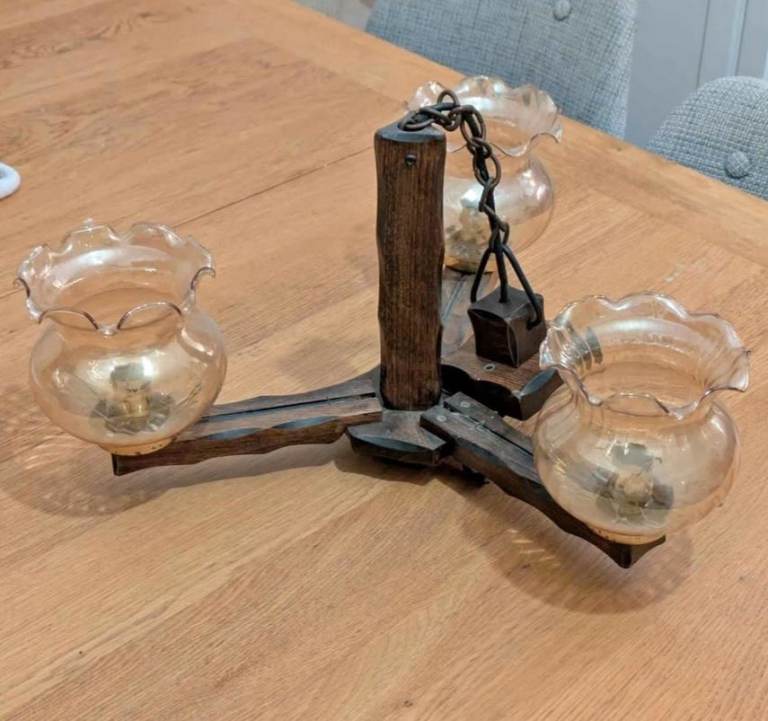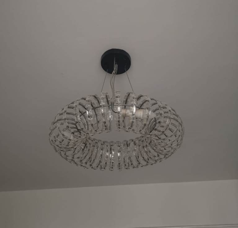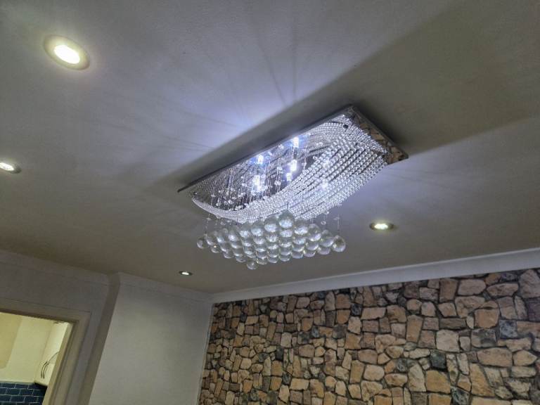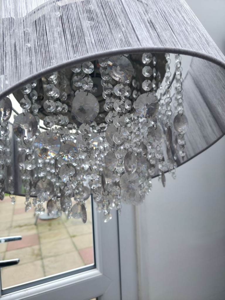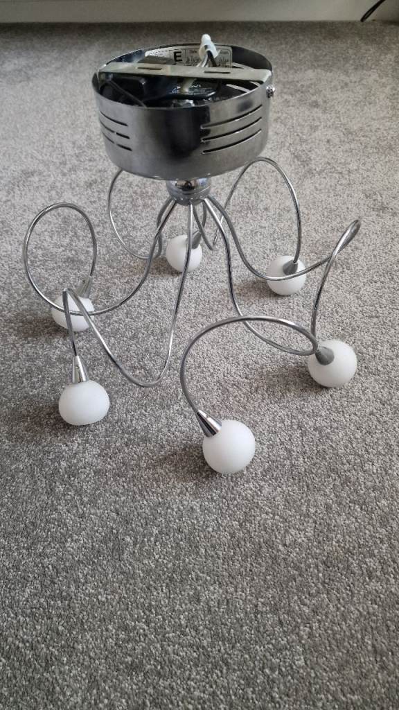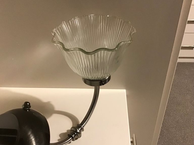 Modern 3 lamp brushed nickel candelabra, diameter 52cm, height from ceiling 72cm, chain length 26cm with 3 ribbed glass shades.