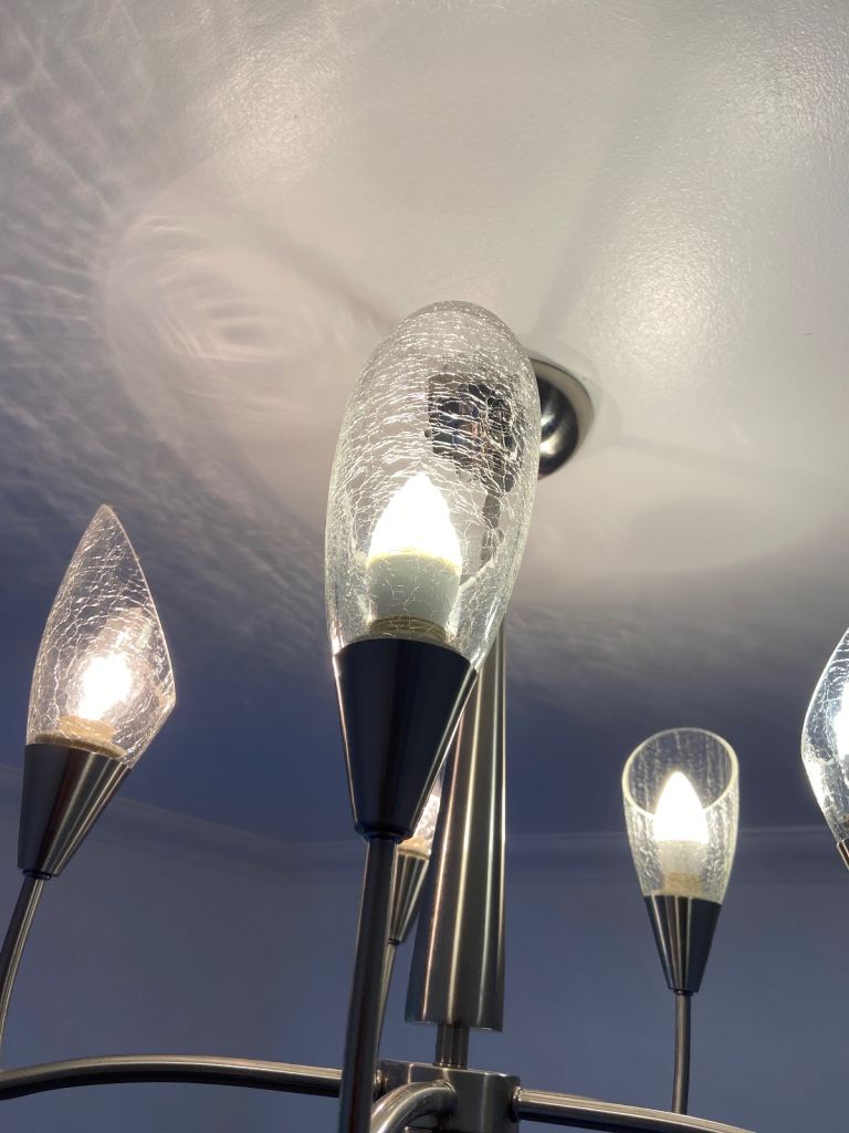Ceiling light bought from Pagazzi for sale. In excellent condition. Takes 5 bulbs. Collect from Uddingston. The light was recently taken down by an electrician and is in perfect working order. Have bubble wrapped the glass. Changes to spotlights, hence the sale.