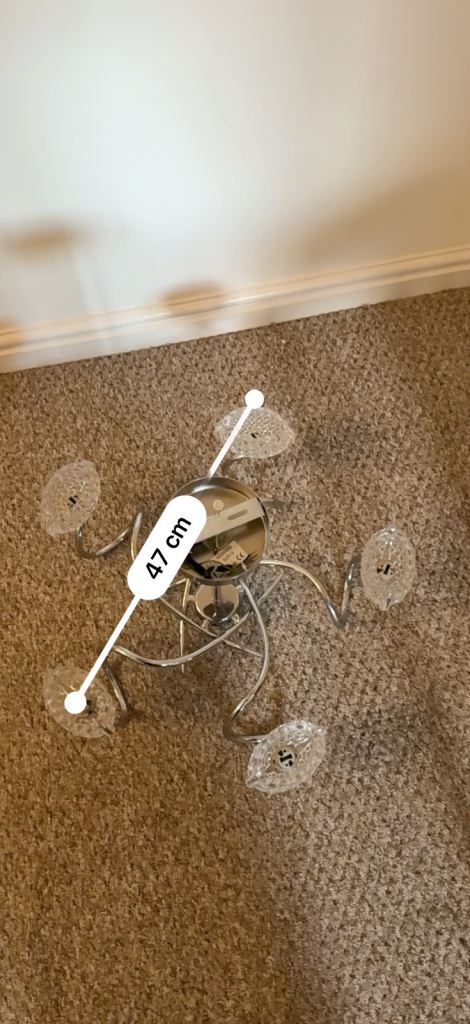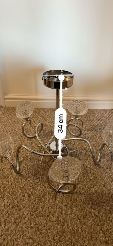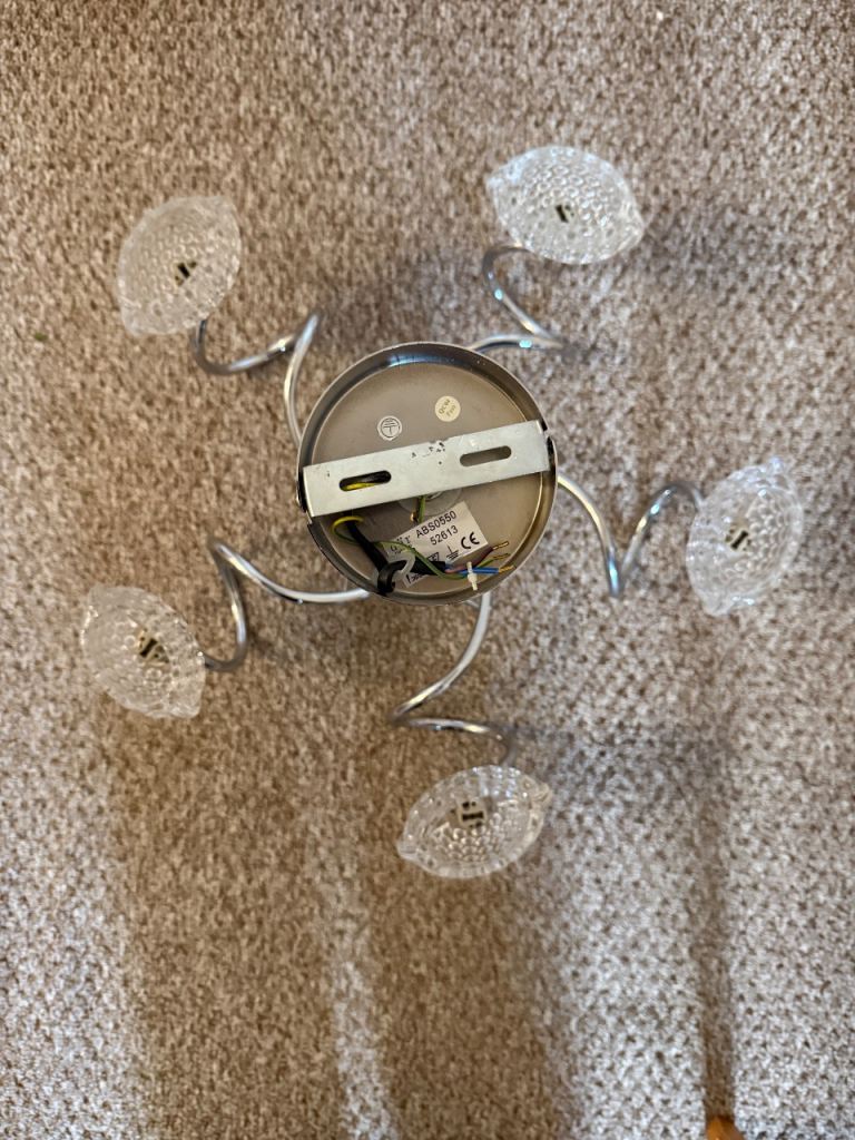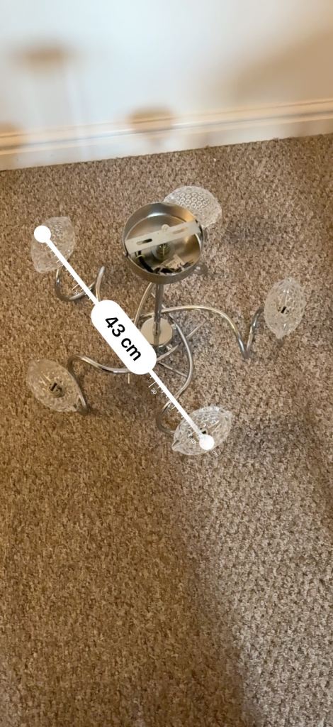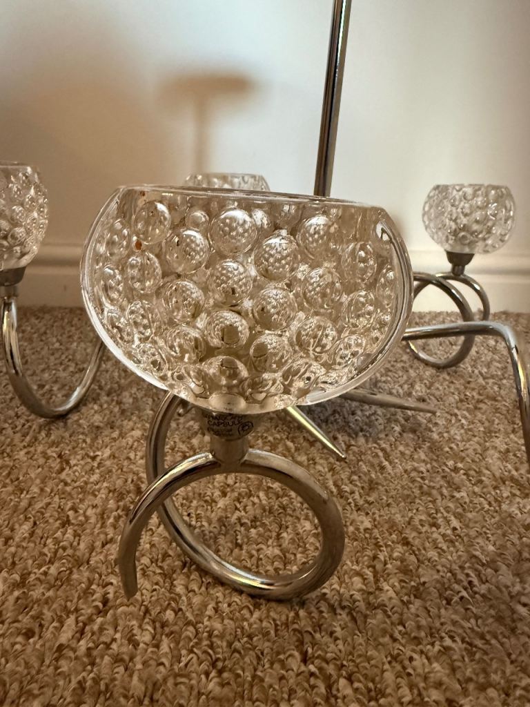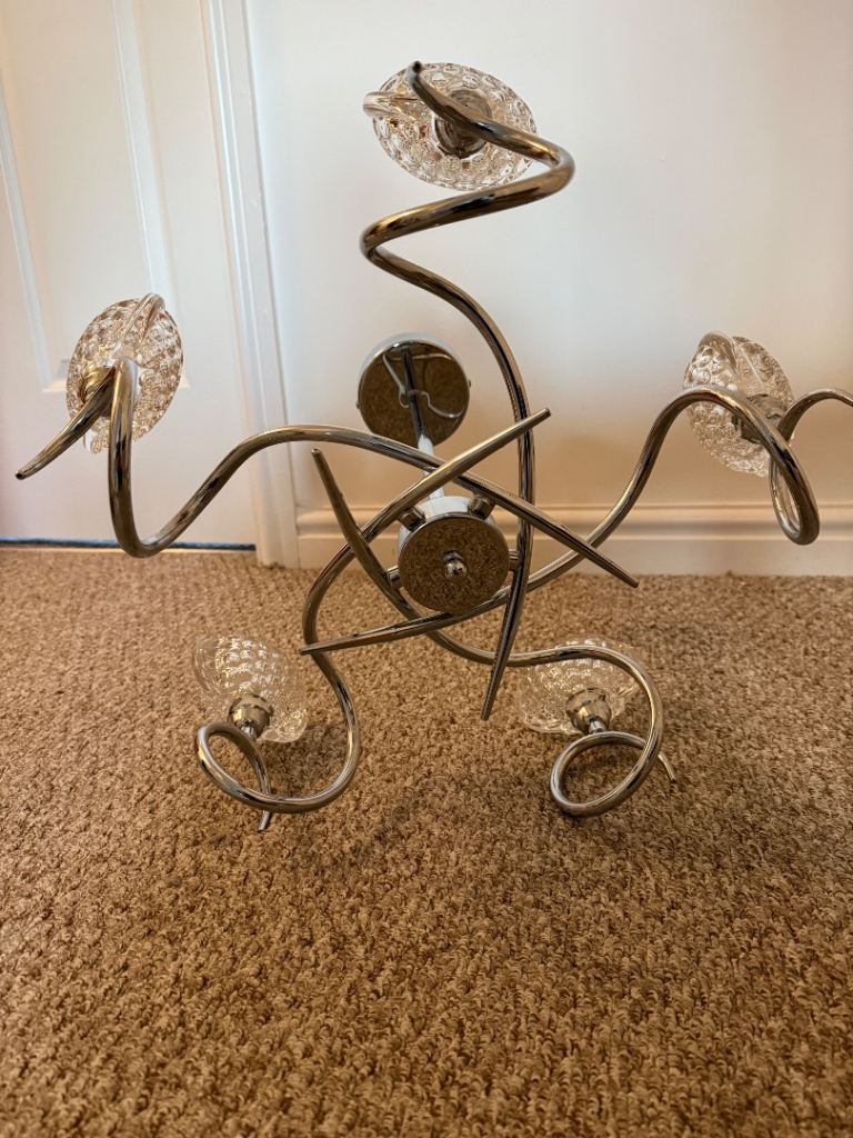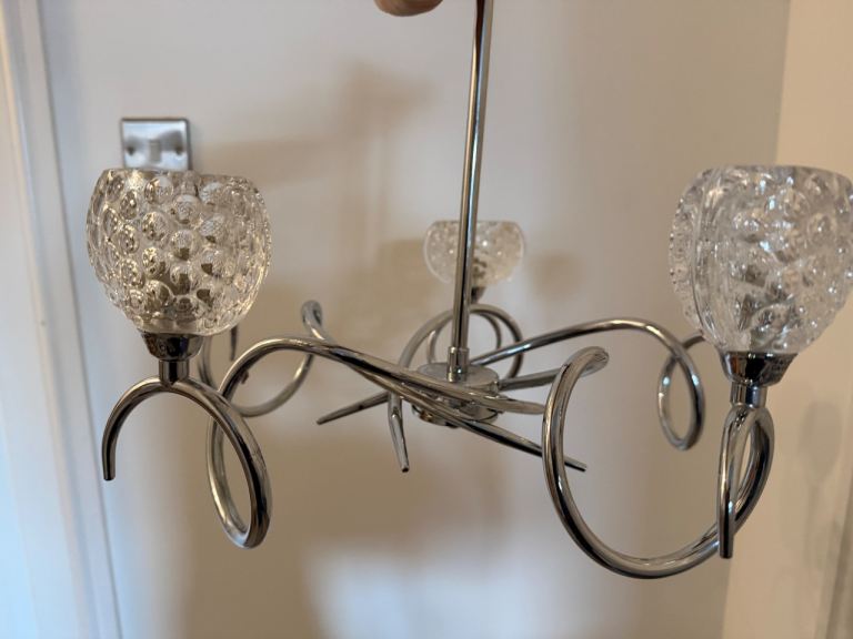 Fixed drop ceiling light, glass shades, chrome arms.