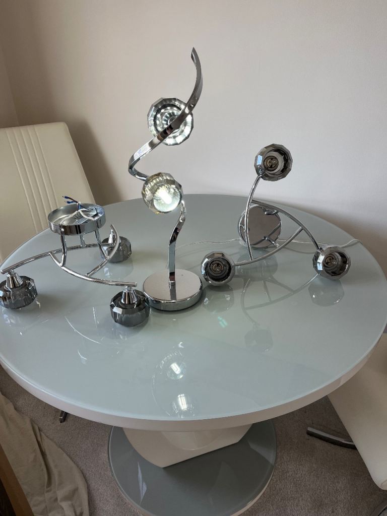 Chrome and glass ceiling lights x2, table lamp x1, good condition
