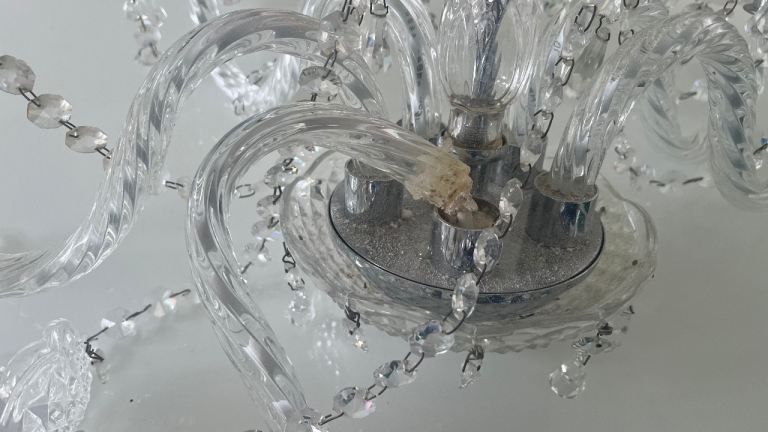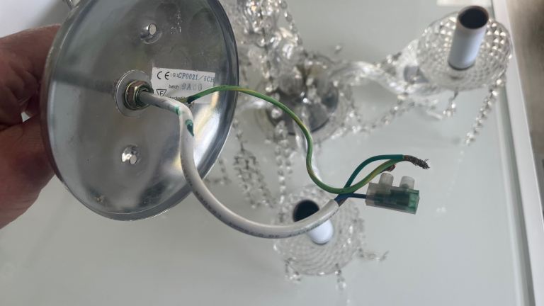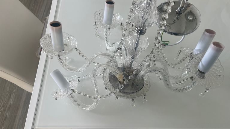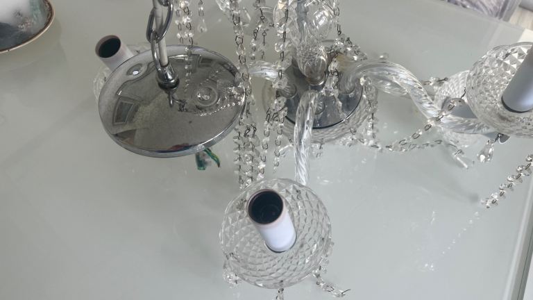 5 lamp (SBC) glass chandalier, one arm loose from socket (see photos) which has had a previous repair but has come loose again. All five sockets work. We have no more use for it so offer it for a new home if someone wants to glue it back together.