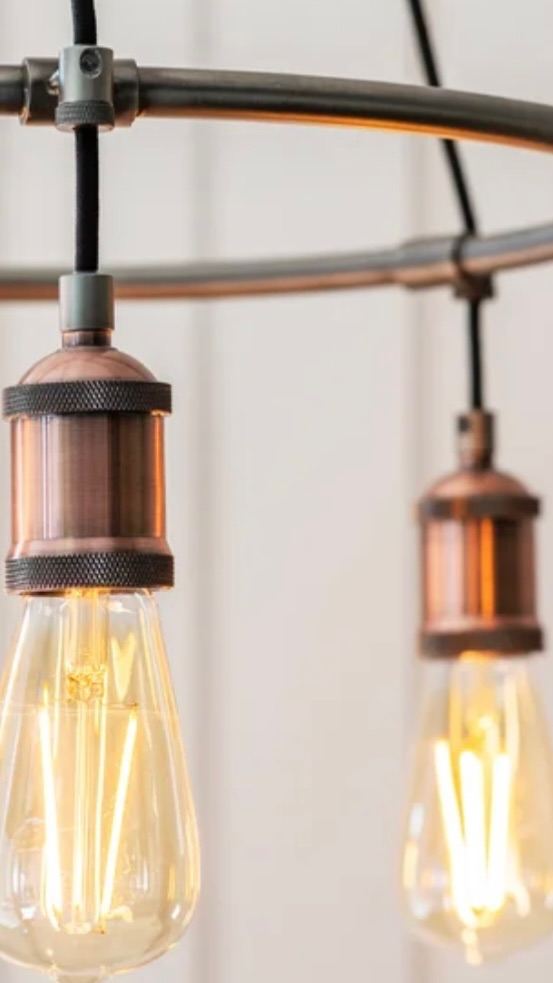 Features a circular metal frame (45cm diameter) with copper-coloured bulb holders.