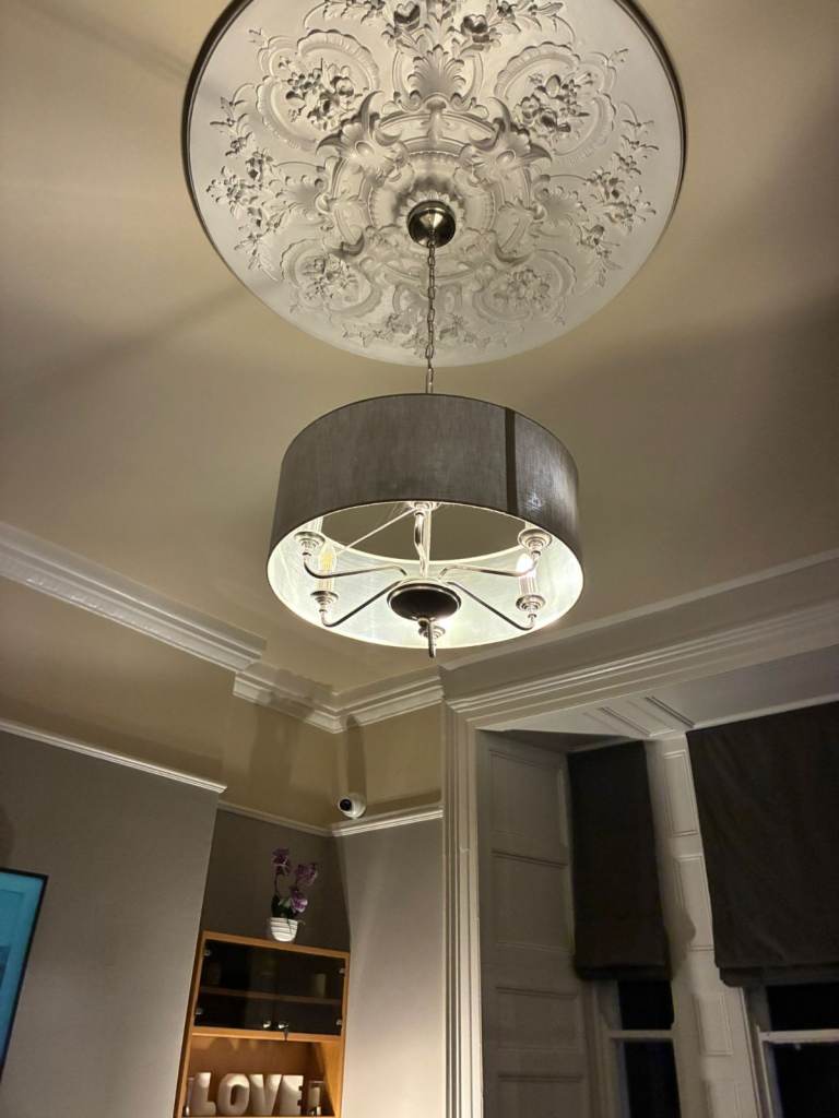 Elegant ceiling light featuring a detailed decorative ceiling rose and a modern grey fabric drum shade. The combination of classic detailing and contemporary design makes it suitable for both modern and period interiors. Suspended on a short chain with a 6 bulb fitting for even light distribution.