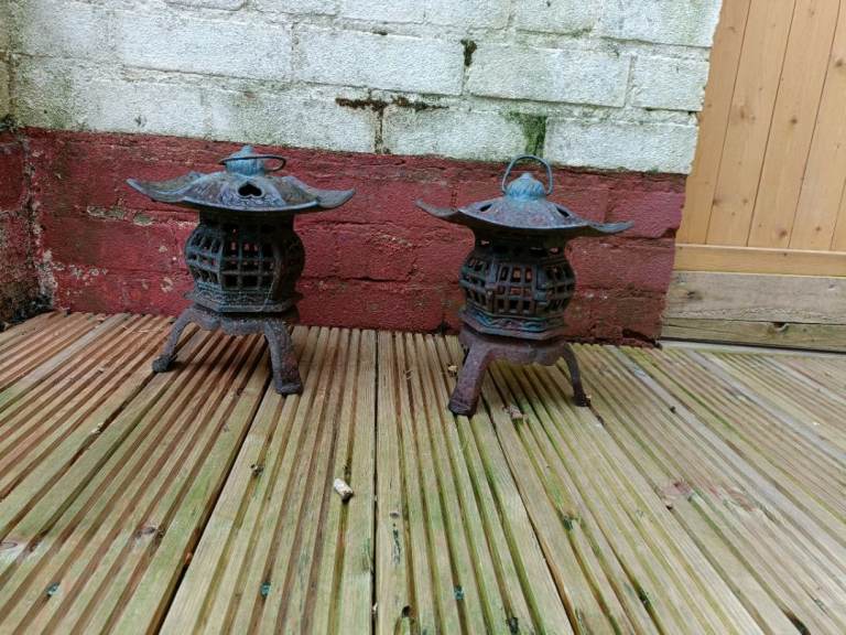 Heavy for there size.Chinse cast Iron lanterns.In well weathered condition.Approx size is 11/12 inch tall.
