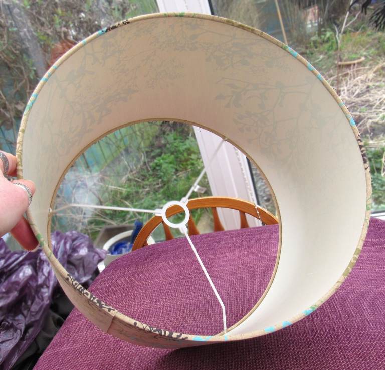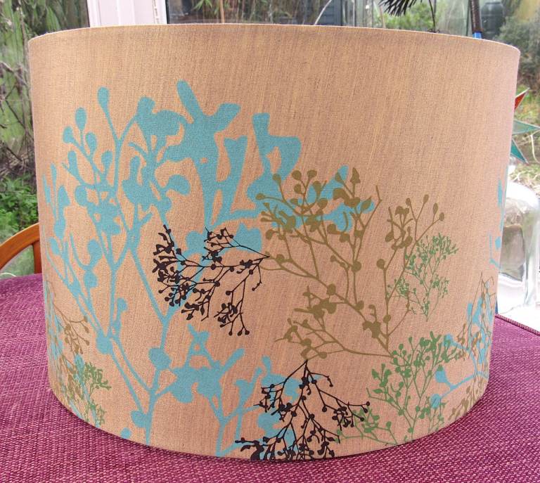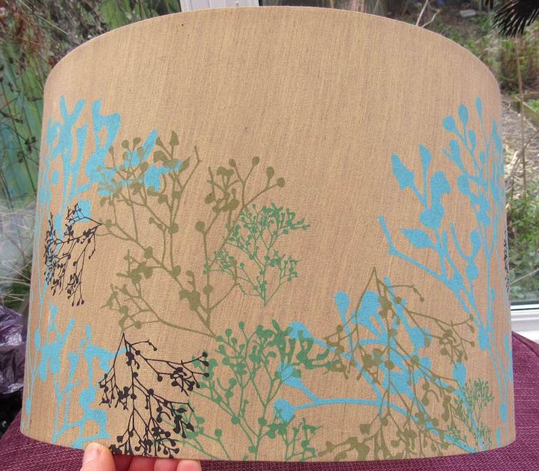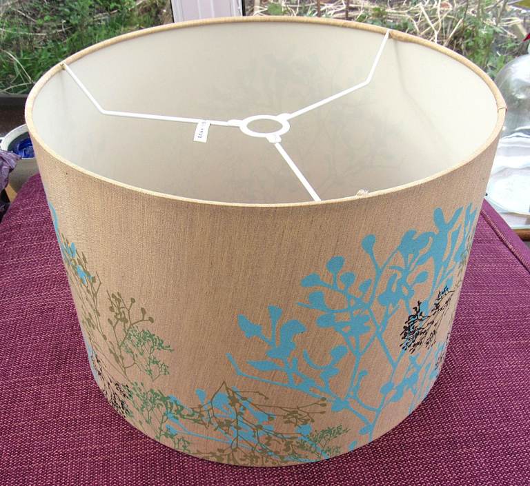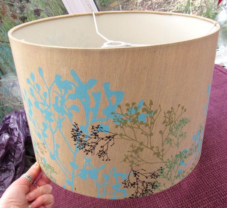 Large Lampshade / Lightshade. Golden Background with Colourful Floral Pattern. Measures approx. 35cm across x 24cm high. From a pet and smoke free home. Some small marks. Great for an upcycling project!