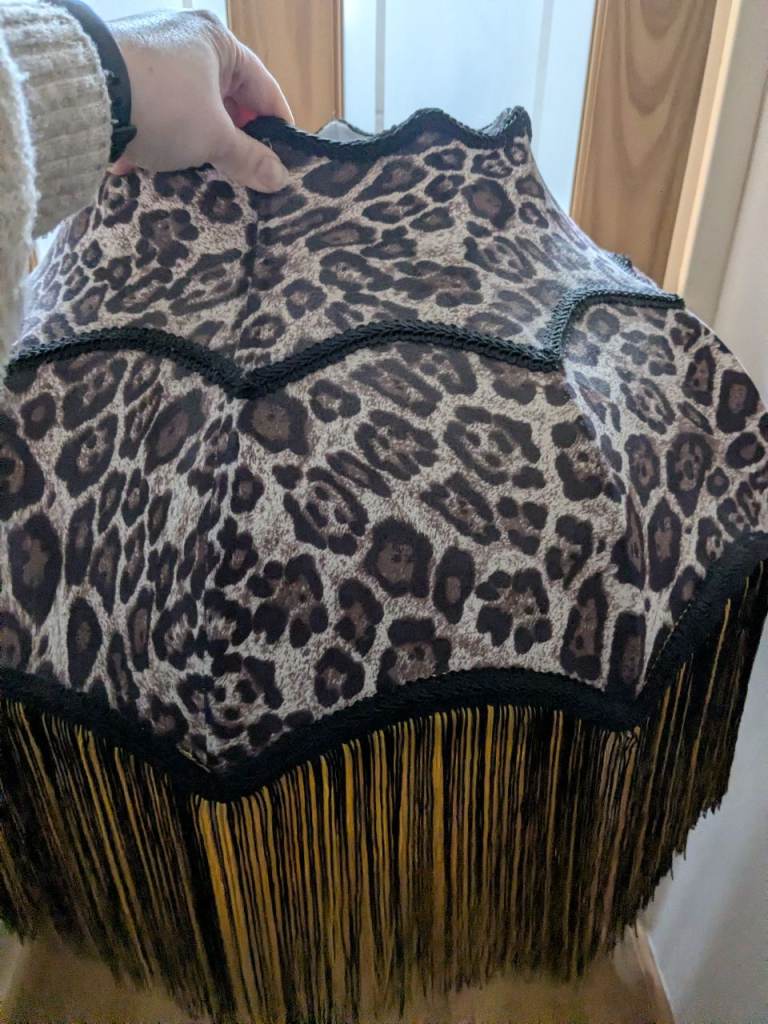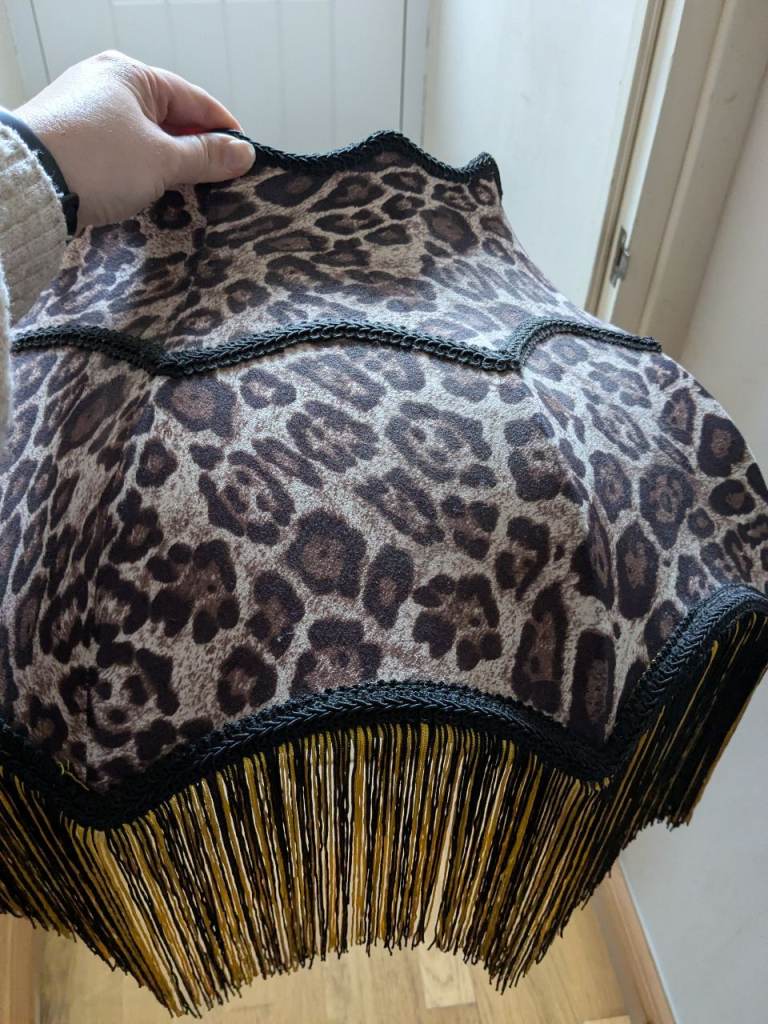 Large Leopard print lamp shade with black and gold tassels. In excellent condition. 57cm across / diameter.