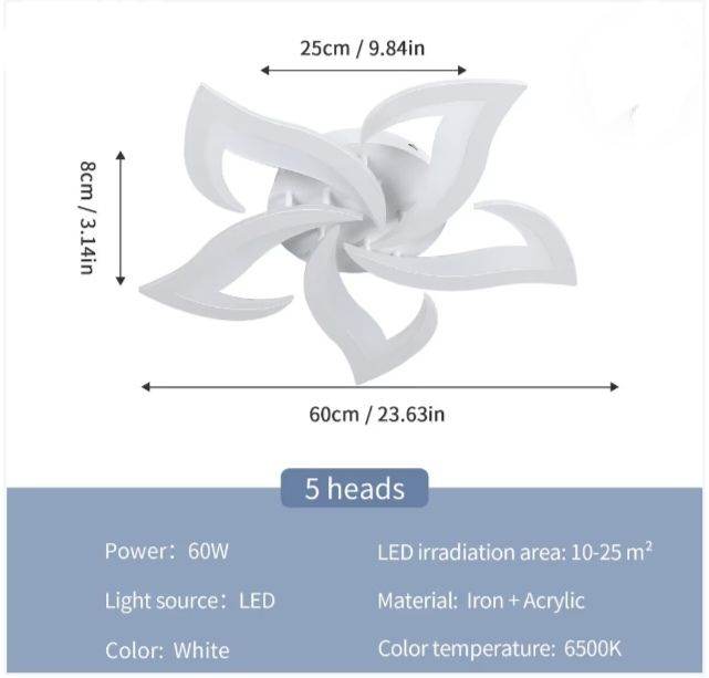 【Lighting Specification】-Dorlink Flower Lamp Dimension: 60×60×8 cm / 23.6x23.6x3.1 inch; Weight: 2150g. Power: 60W; Voltage: 220V; Color temperature: 6500K Cool white. Lighting area: 15-20m². This modern ceiling light features outstanding lighting performance, beautifully enlighten and decorate your interior.