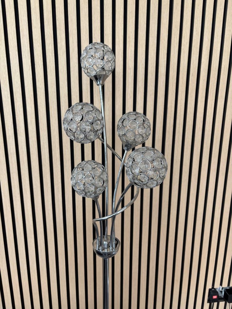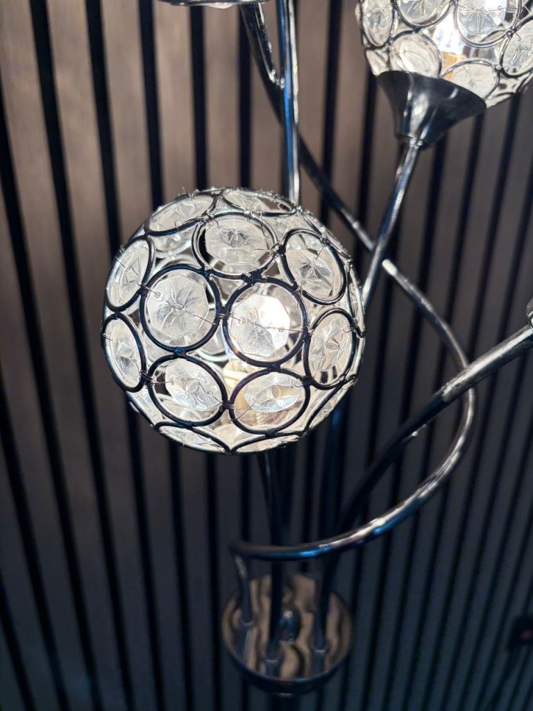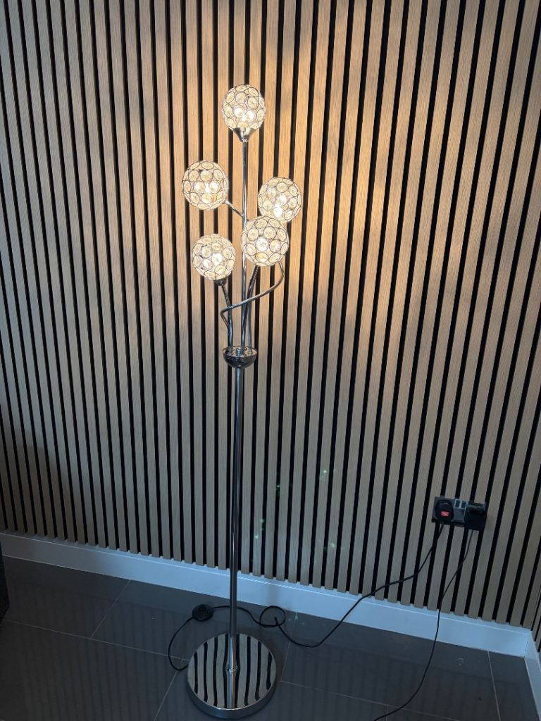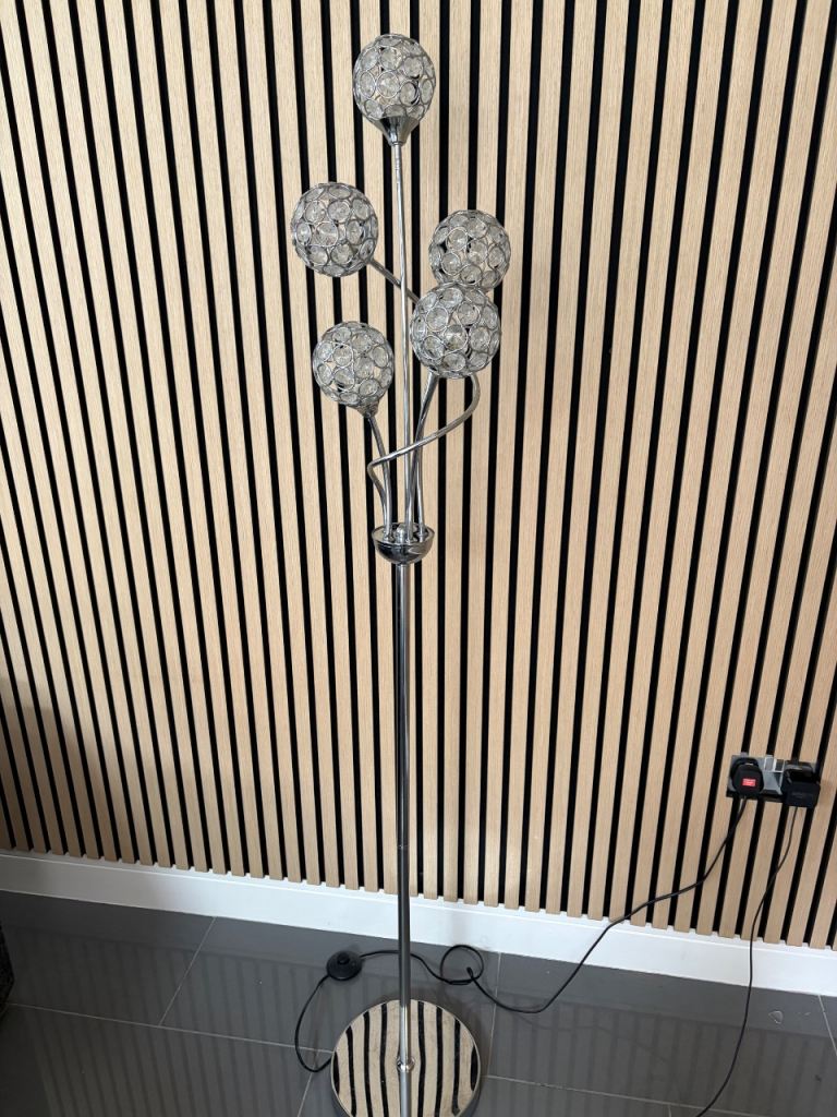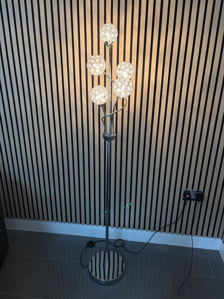 Length 74cm (adjustable), width of top chrome bar 50cm, total width of 3 lights 66cm and matching chrome 5 globe floor lamp height 155cm base width 26cm push foot and switch. Smoke and pet free home. Collection only from B90