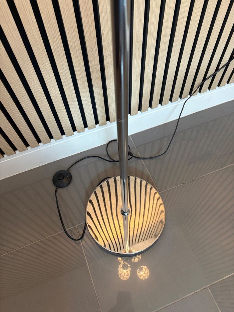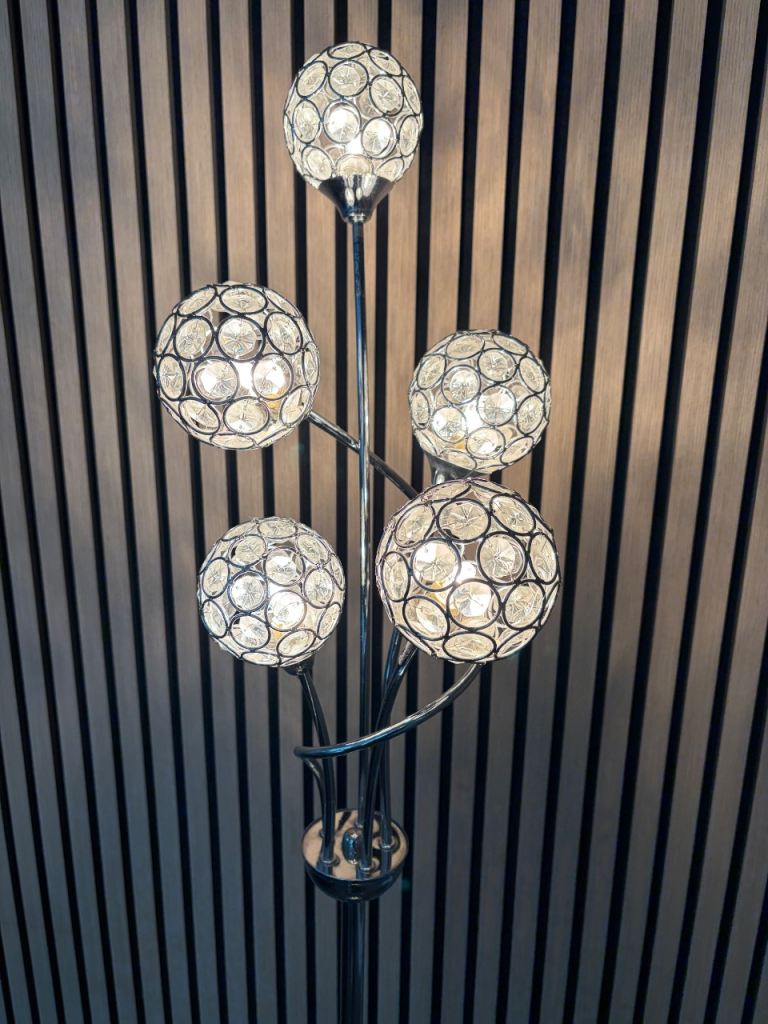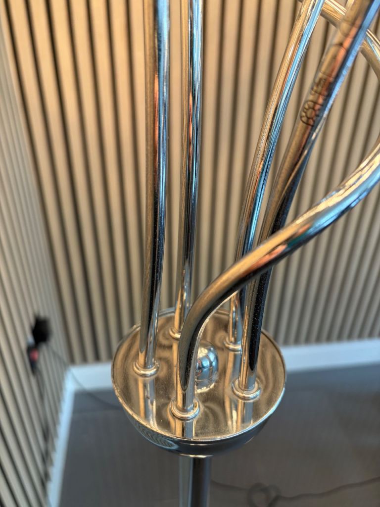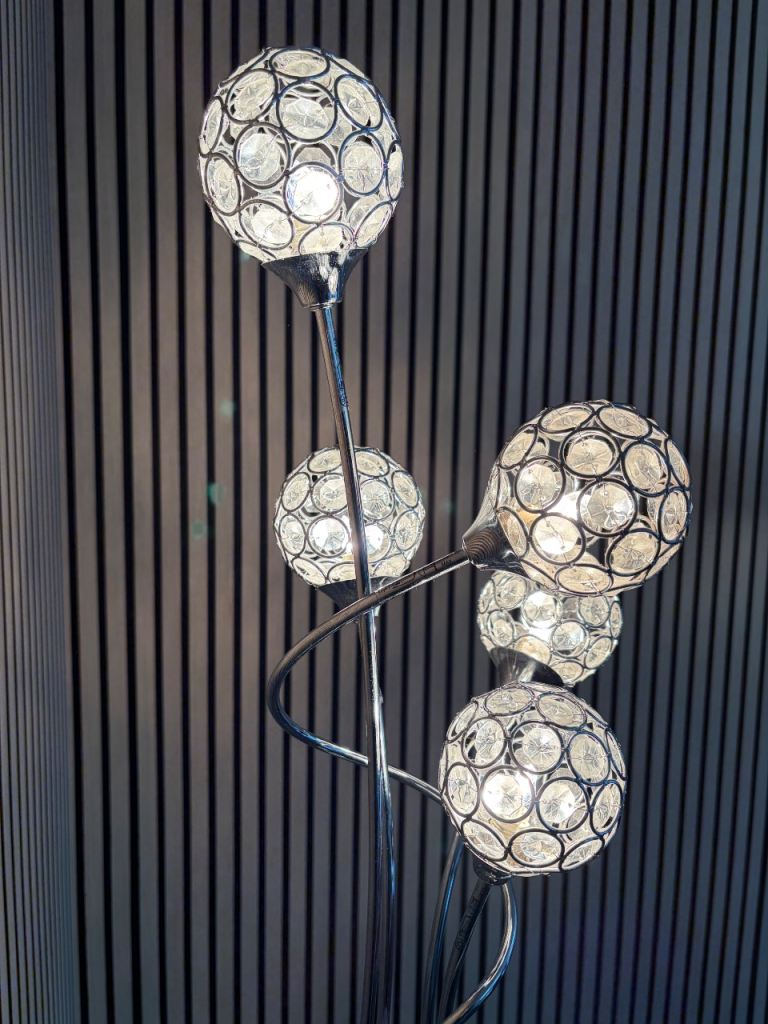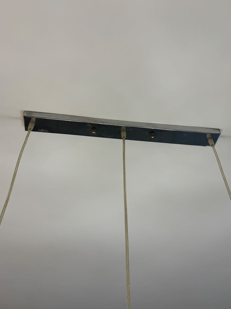 Length 74cm (adjustable), width of top chrome bar 50cm, total width of 3 lights 66cm and matching chrome 5 globe floor lamp height 155cm base width 26cm push foot and switch. Smoke and pet free home. Collection only from B90