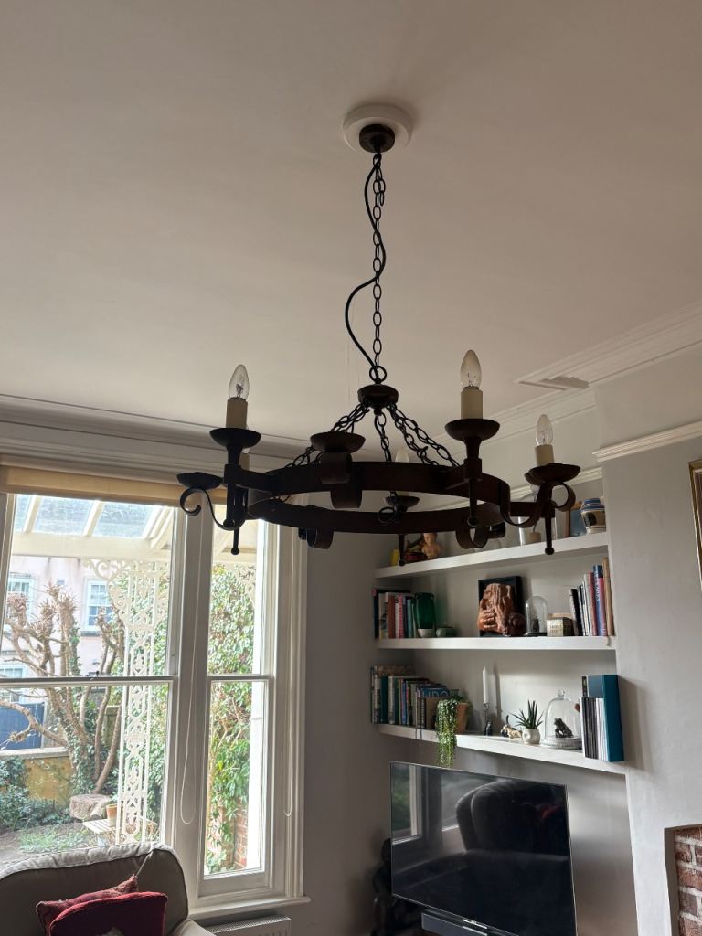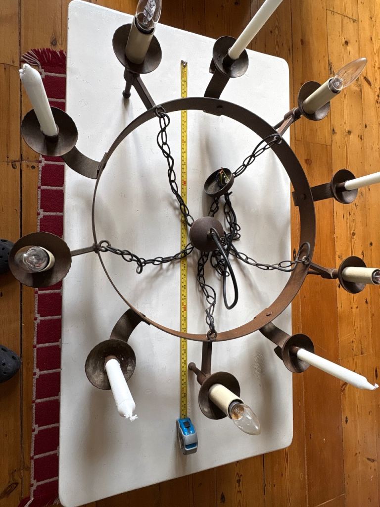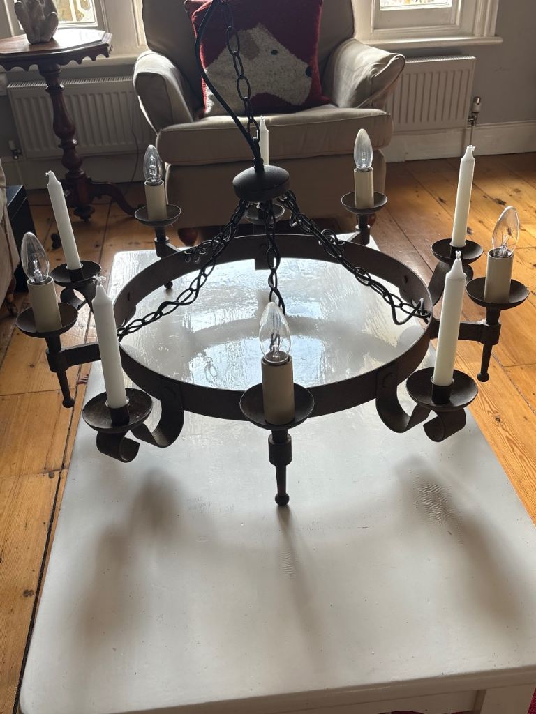 We are selling our aged steel chandelier with 5 candle bulbs and 5 candle holders. Fully wired and working. It is very solid and well made, looking for a new home. 80cm in diameter. Candles can be removed if not needed.