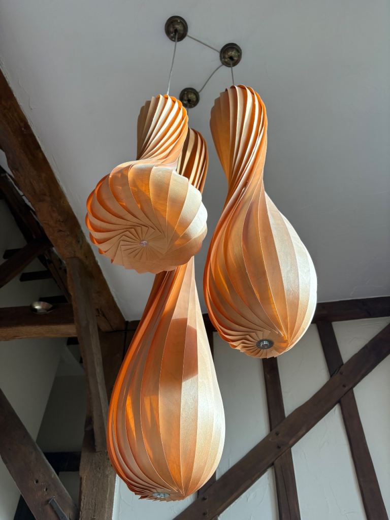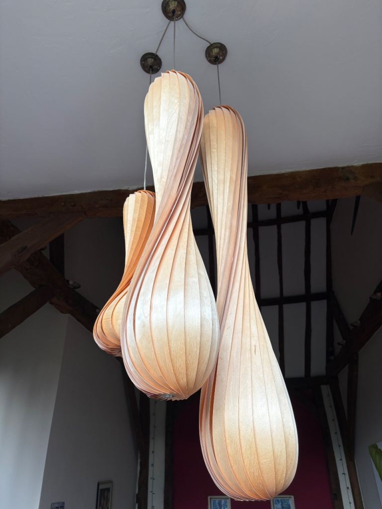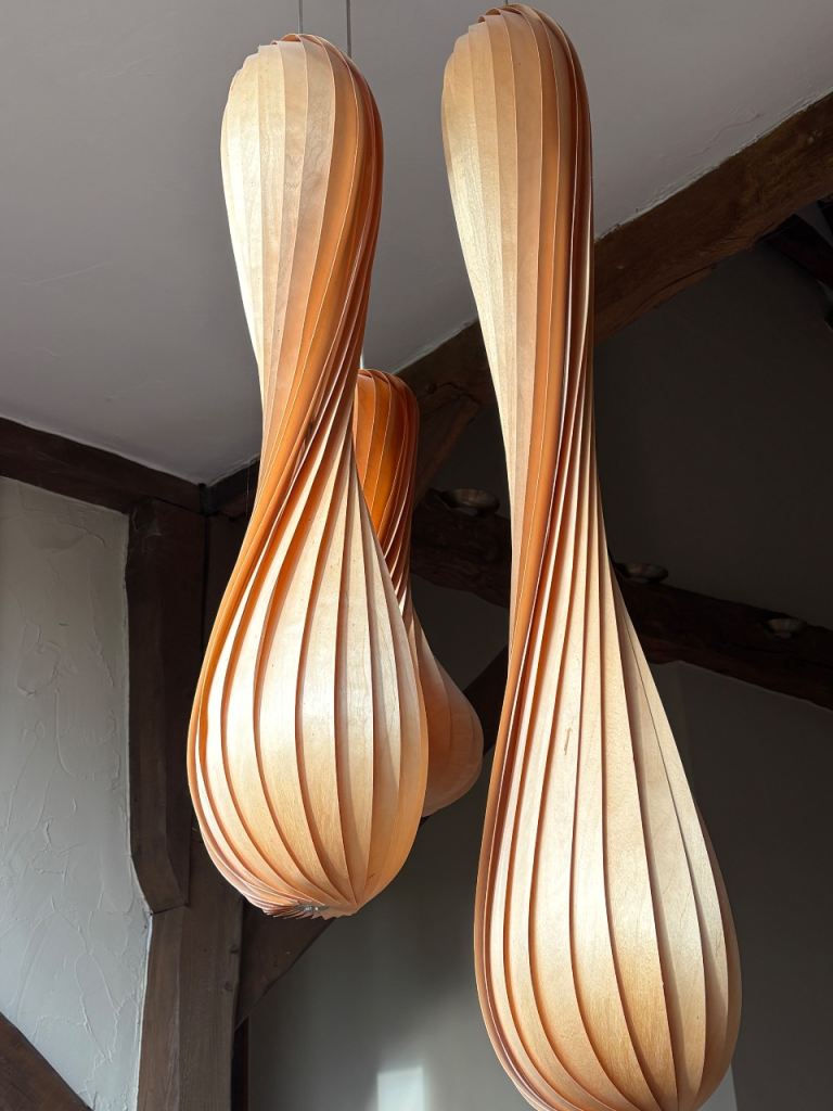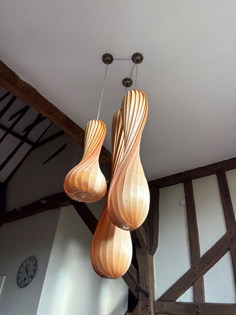 Stunning Tom Rossau TR7 birch veneer lampshade in an organic twist shape. Shade is 145cm tall. Width is 25cm at widest point and 12cm at narrowest. Comes with brass ceiling fitting (11cm diameter). Takes E27 screw in bulbs. Last four photos shows the shade in situ but the smaller two shades are not included in the sale. Small discolouration on one slat and very edge of next one as shown in photo. Otherwise excellent condition with all slats intact. Please note that due to the size and delicate nature of this item it is collection only unless the buyer organises both the collection and the packaging themselves.