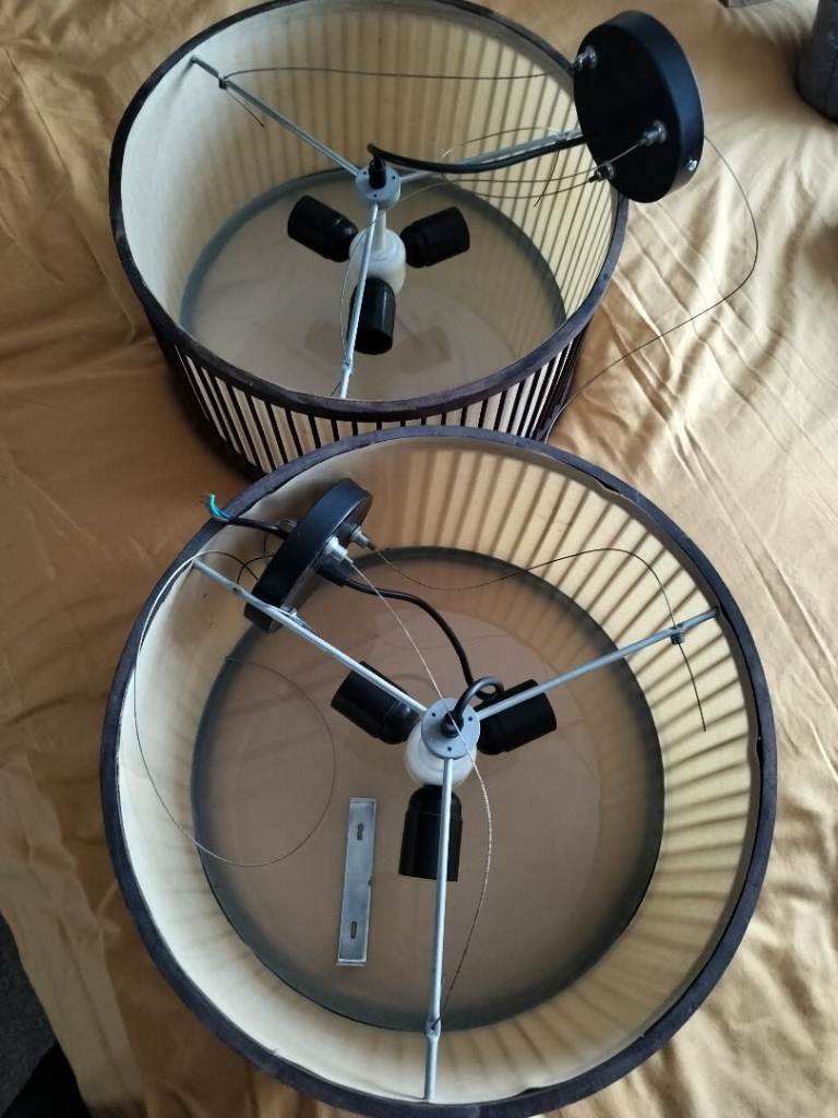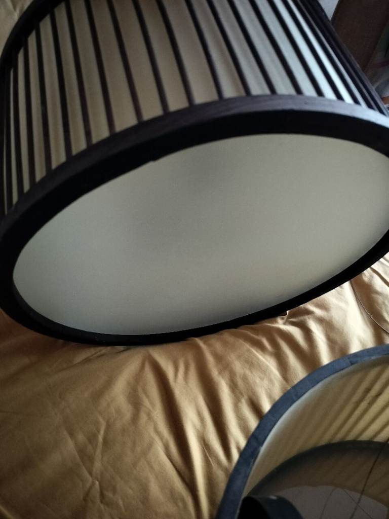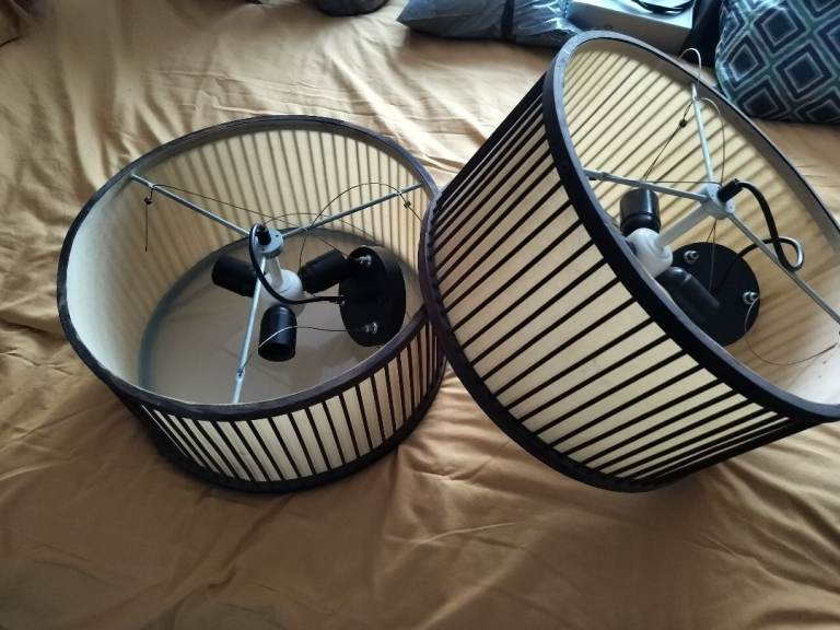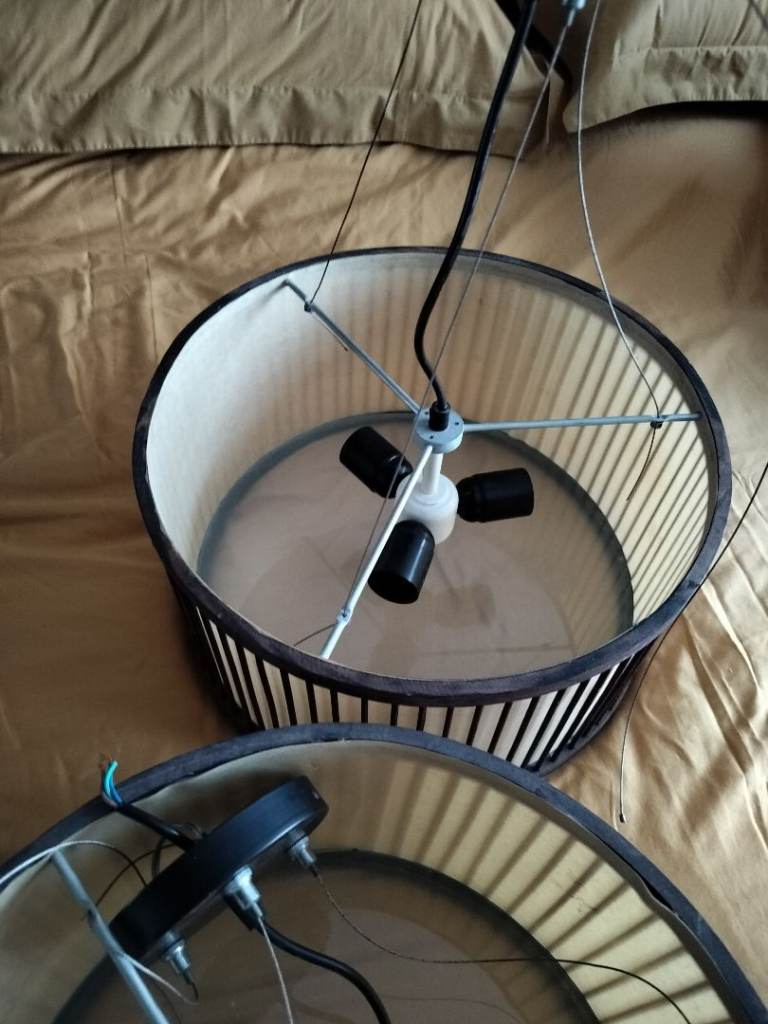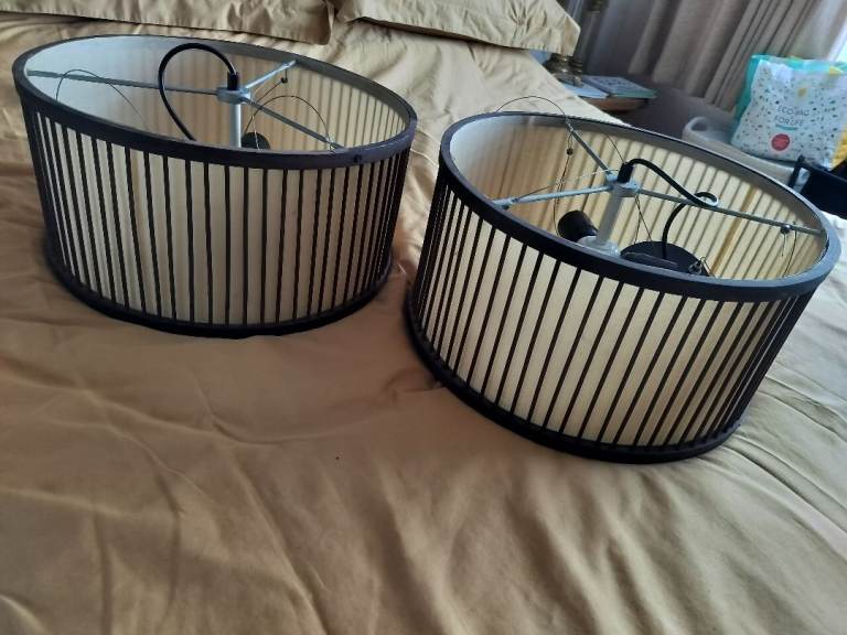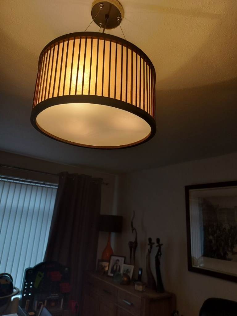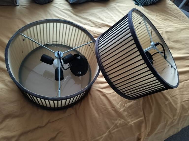 DARK BROWN WOOD FRAME WITH CREAM DRUM INSERT. BLACK CEILING FITTING AND BLACK CABLE