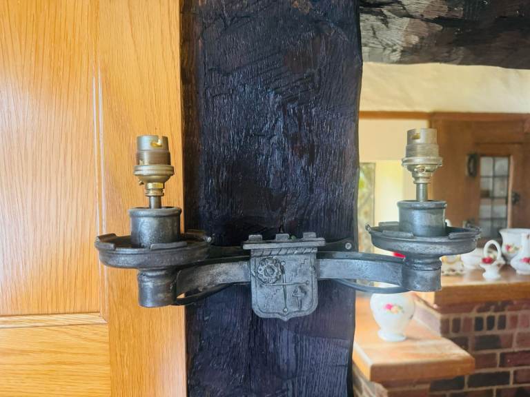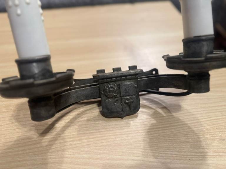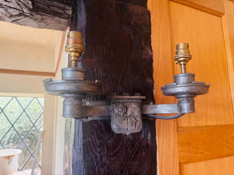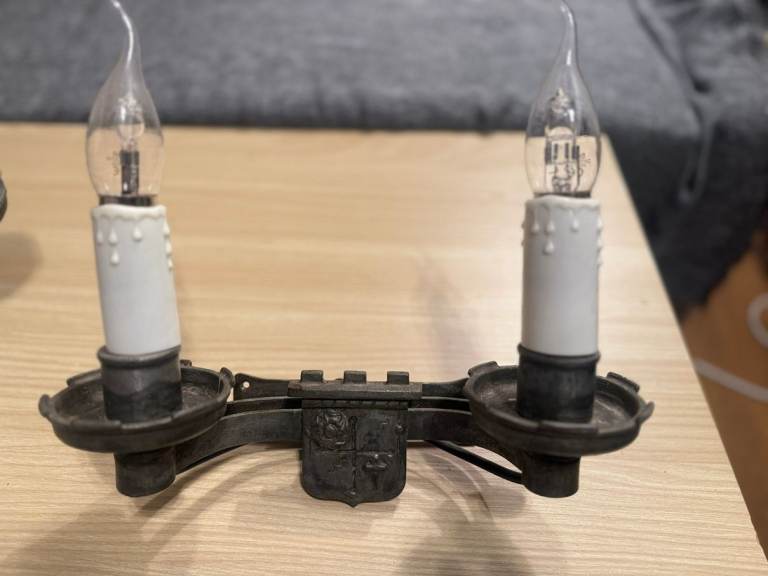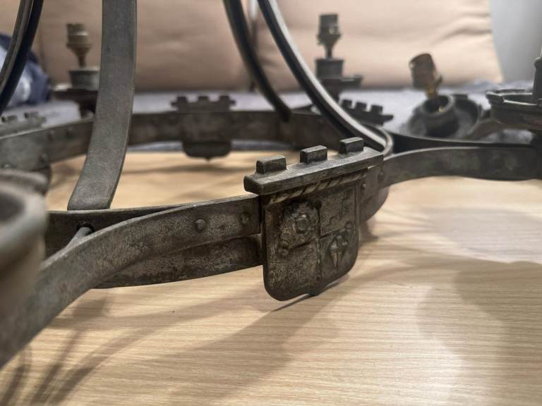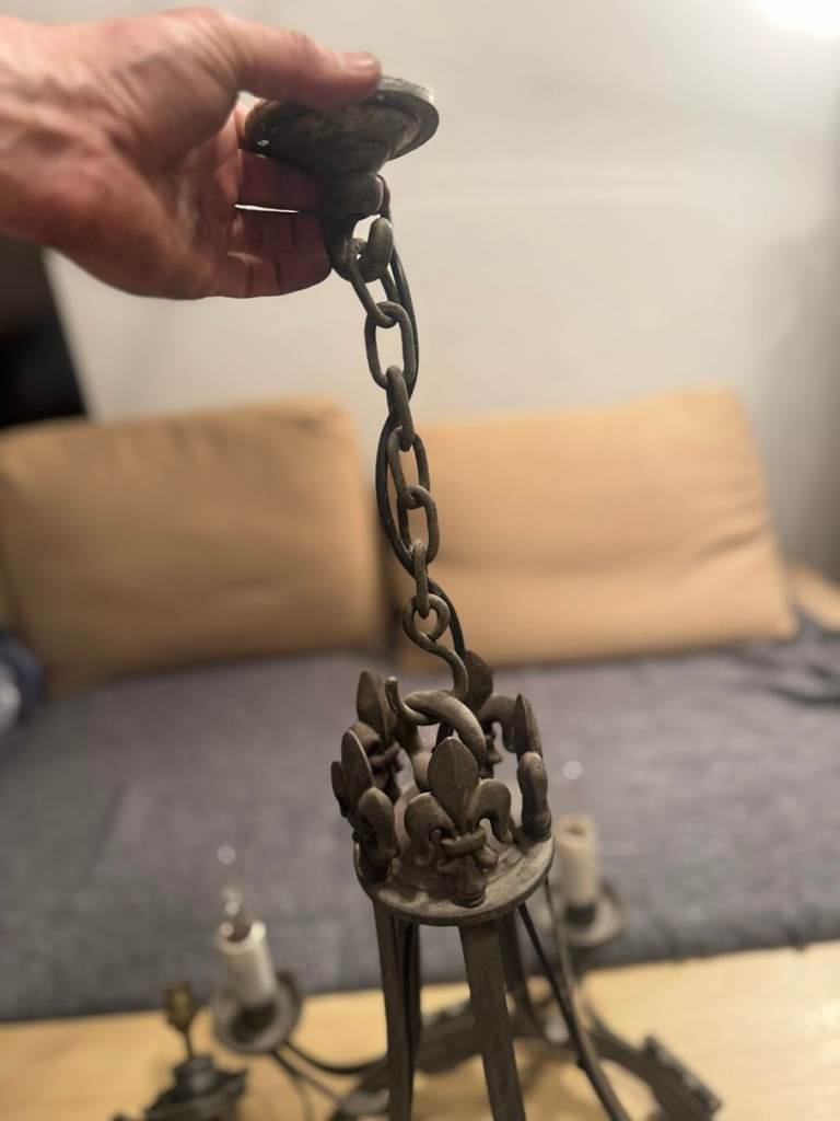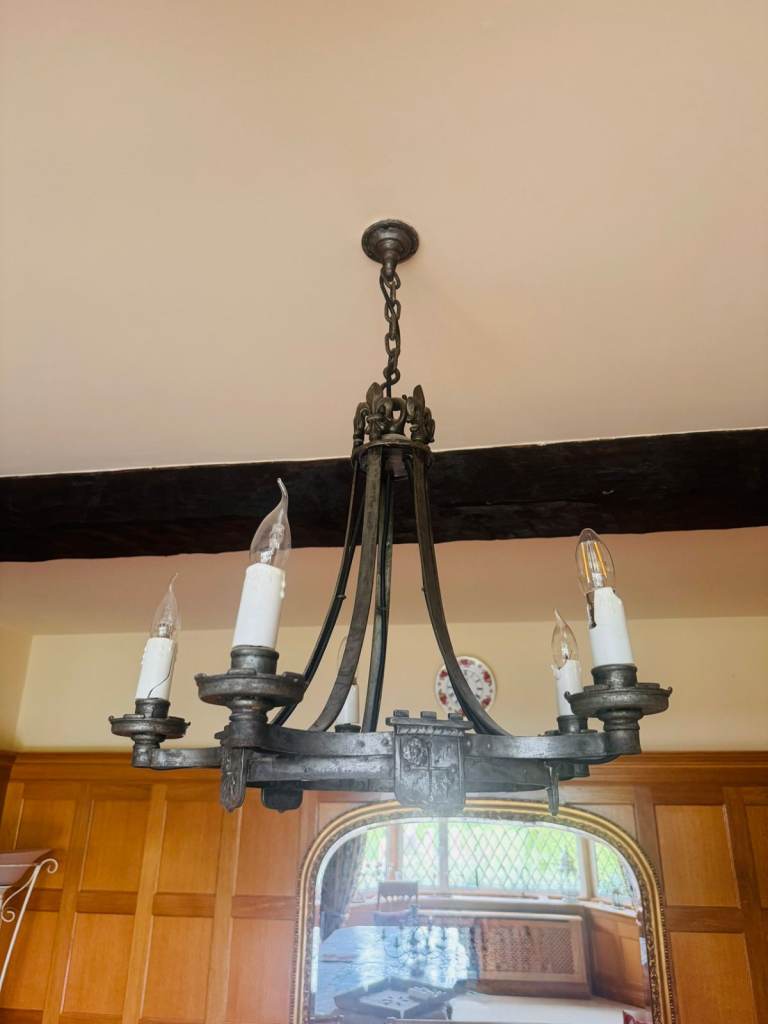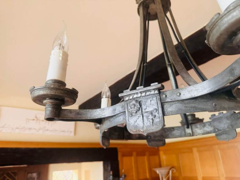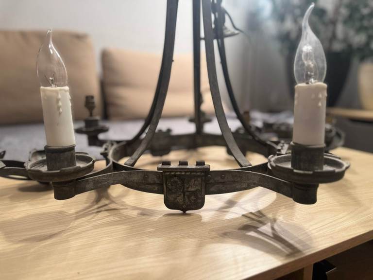 Based on its hand-forged construction, design style, and patina, this chandelier is likely from the mid-20th century (1930s–1960s), though it may draw inspiration from earlier Tudor or medieval design traditions. Exact dating is difficult without maker’s marks, but its craftsmanship and aesthetic align with vintage handcrafted ironwork from this era