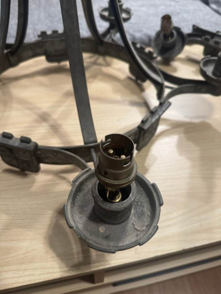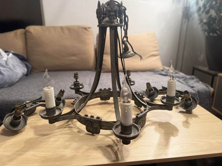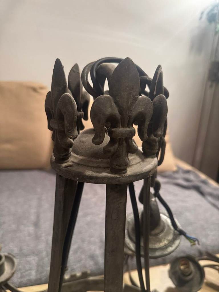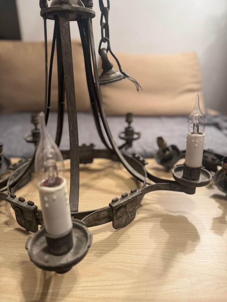 This stunning, one-of-a-kind chandelier features a hand-forged iron frame with a rustic, aged finish, embodying the timeless charm of Tudor or Arts & Crafts design. Its sturdy, handcrafted construction showcases intricate metalwork, including decorative detailing on the central hub and curved arms, each holding a candle-style bulb holder (bulbs not included, all candle-style plastics are broken due to age, need to be printed on 3D printer). The chandelier hangs from a robust iron chain and ceiling mount, making it a striking focal point for any space—perfect for adding warmth and character to a dining room, living area, or entryway.