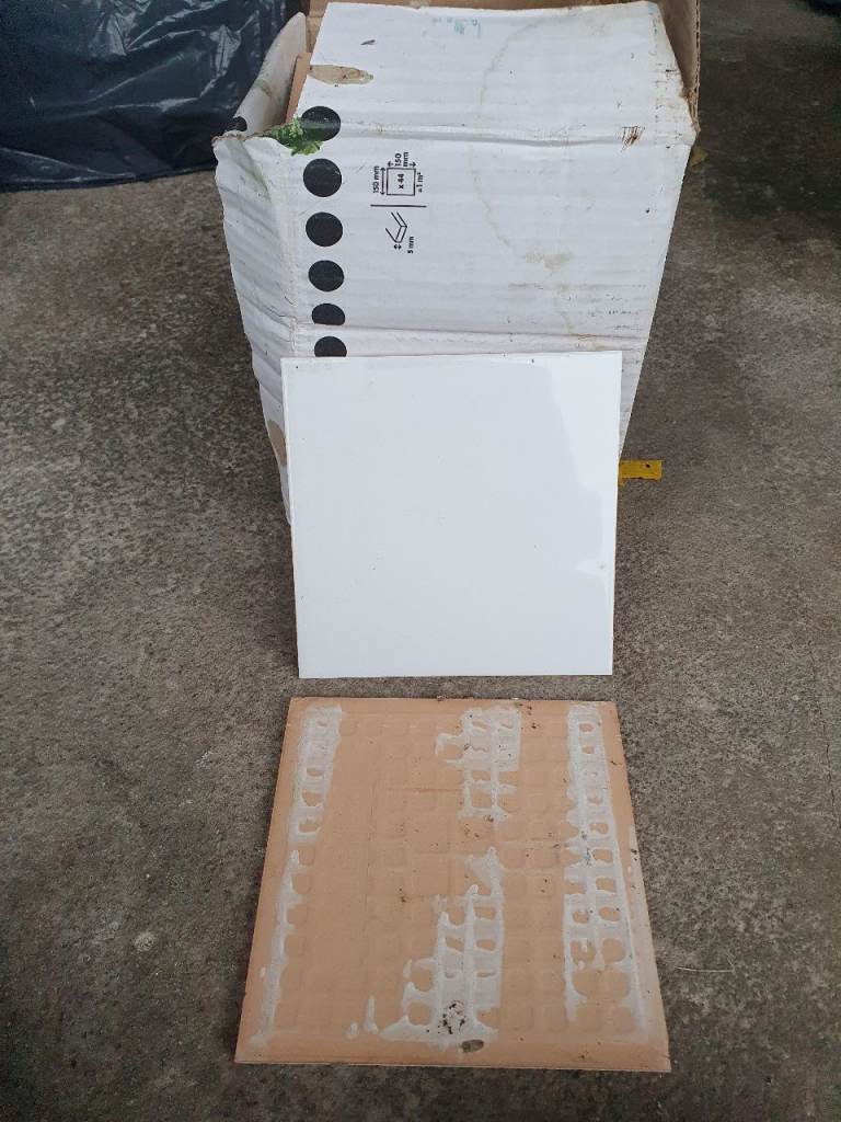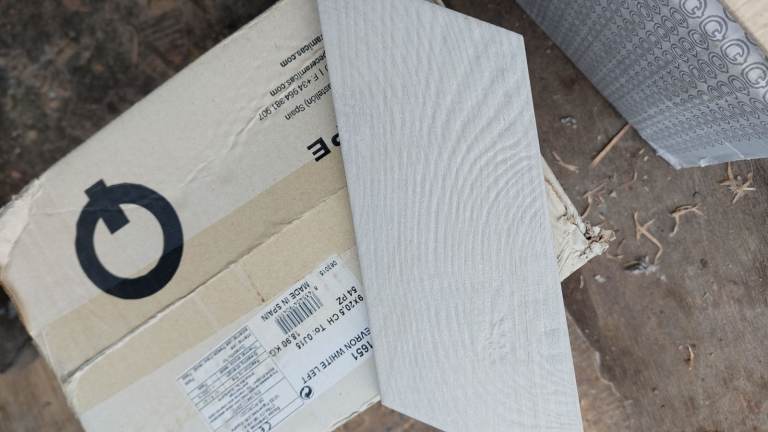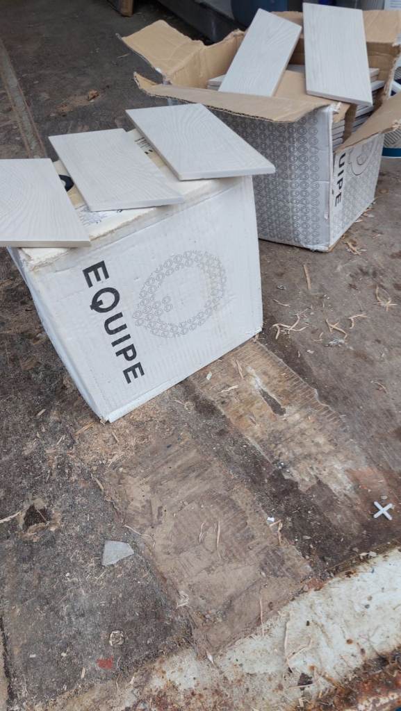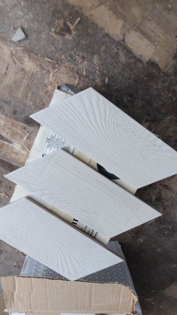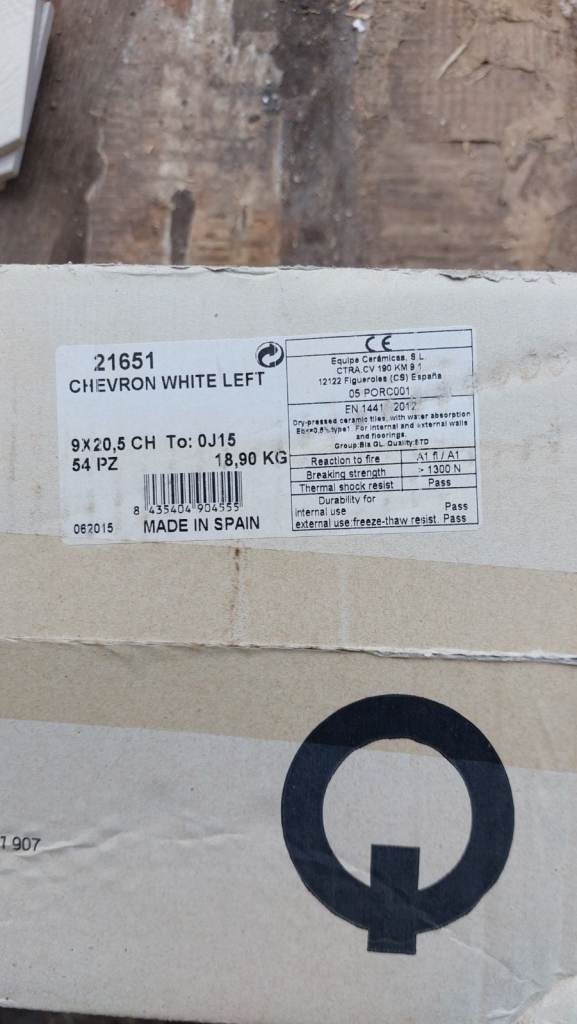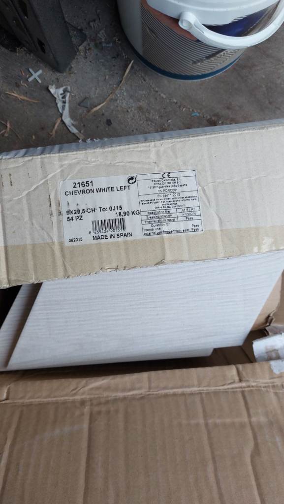2 boxes of White Equipe Chevron (left) Ceramic Tiles for sale. In unused condition. Lovely timber grain effect style on the face of tiles as shown in photos.