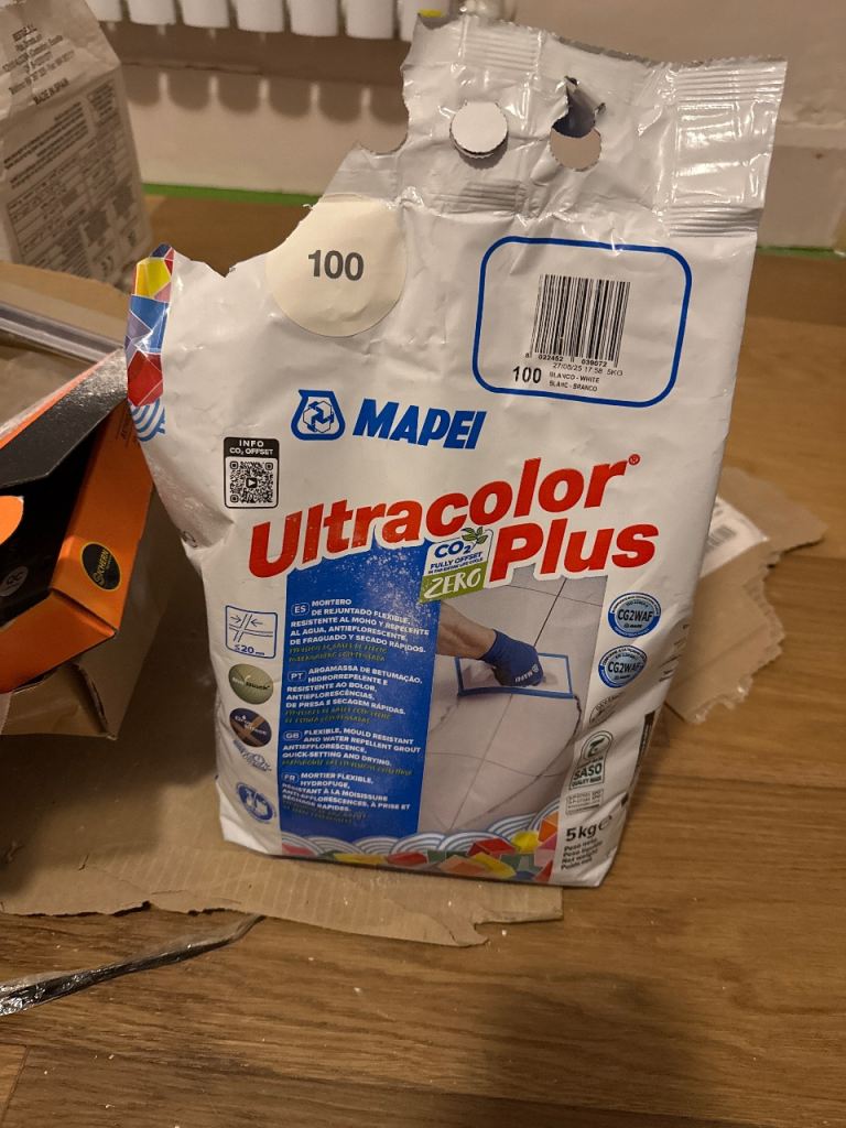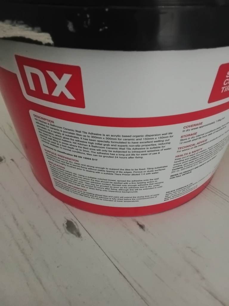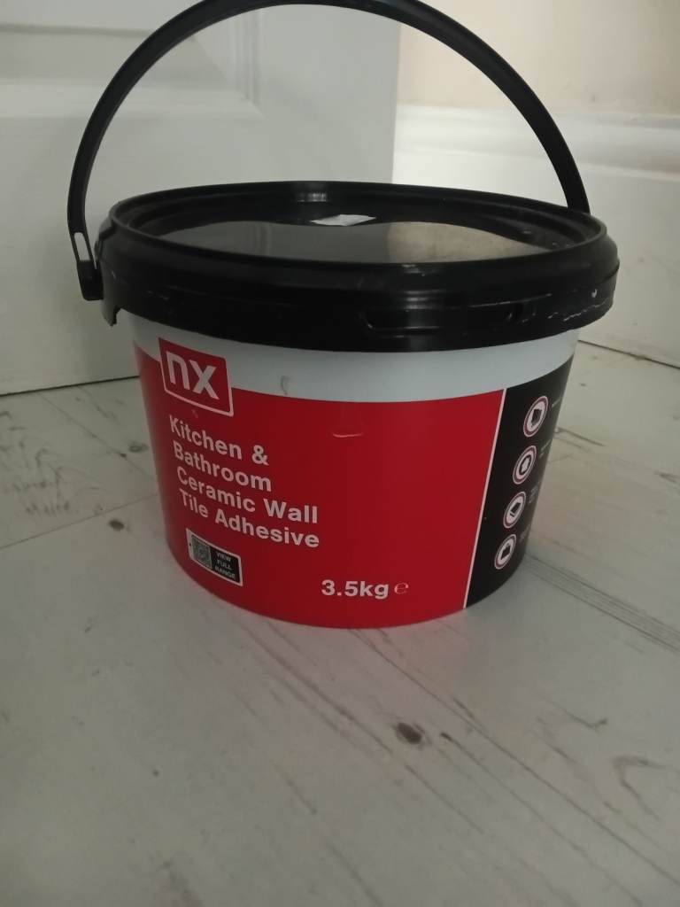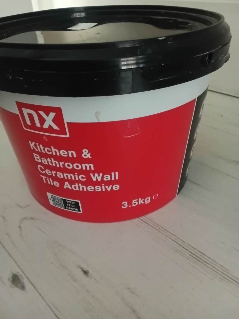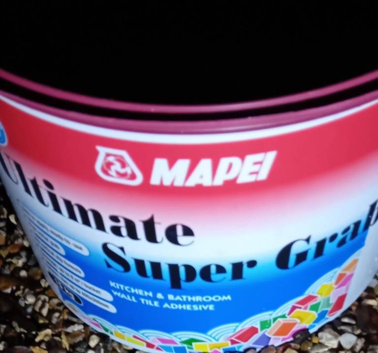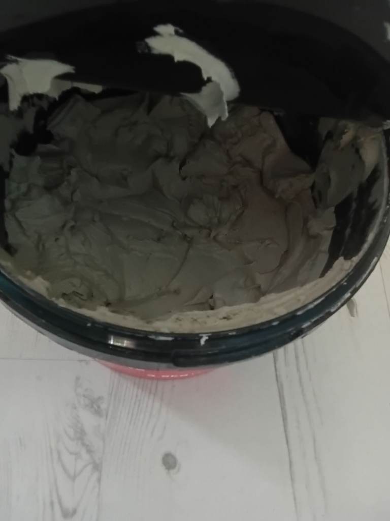 Half tub of tile adhesive.
