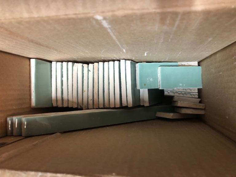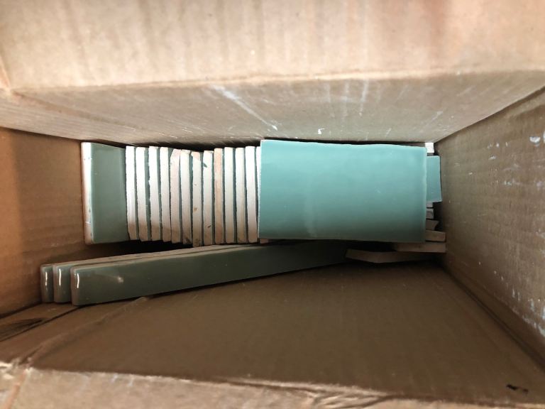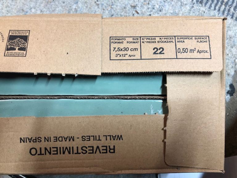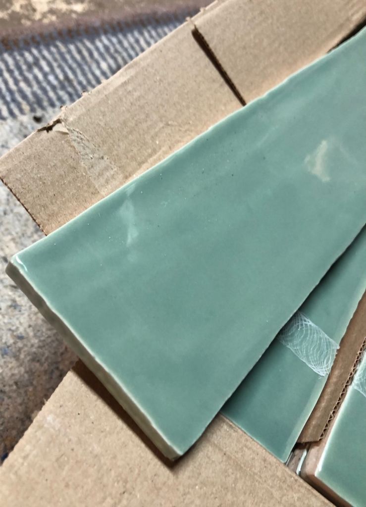 22 Sage green gloss rustic tiles, 7.5 x 30cm, 0.5 meters square plus various cut pieces. Collection from Ashwellthorpe NR16