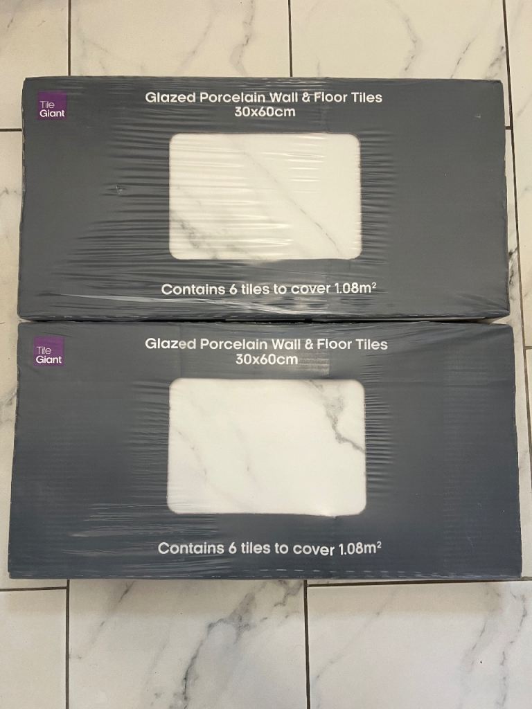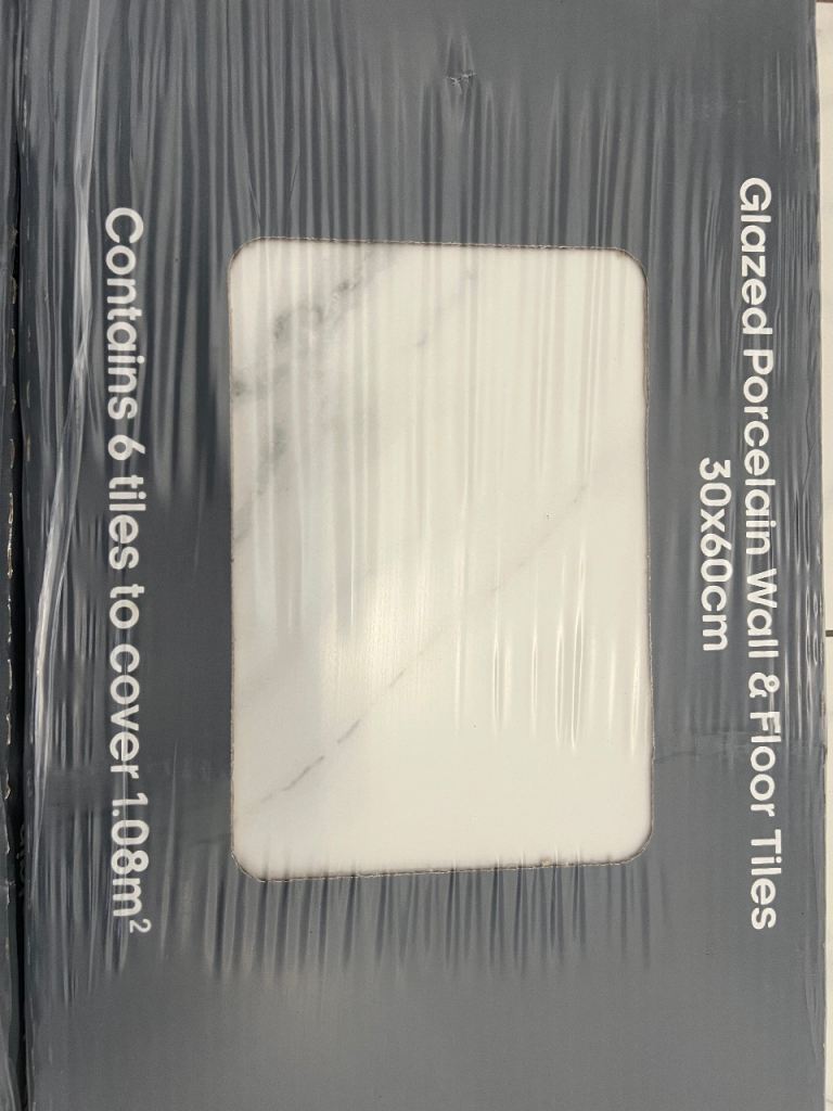 2 packs of tiles 30x60cm can be use for floor or wall marble effect. Each pack contains 6 tiles and will cover 1.08m2. Total 12 tiles that will cover area up to 2.16m2. As per pictures still in original packaging.