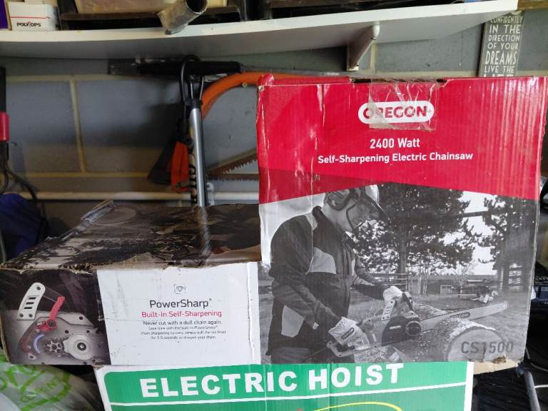 Brand new electric chainsaw, 2400w. 6m cord. Self sharpening. Bought from B&Q a year ago £100+ but never used, not even taken out of box.