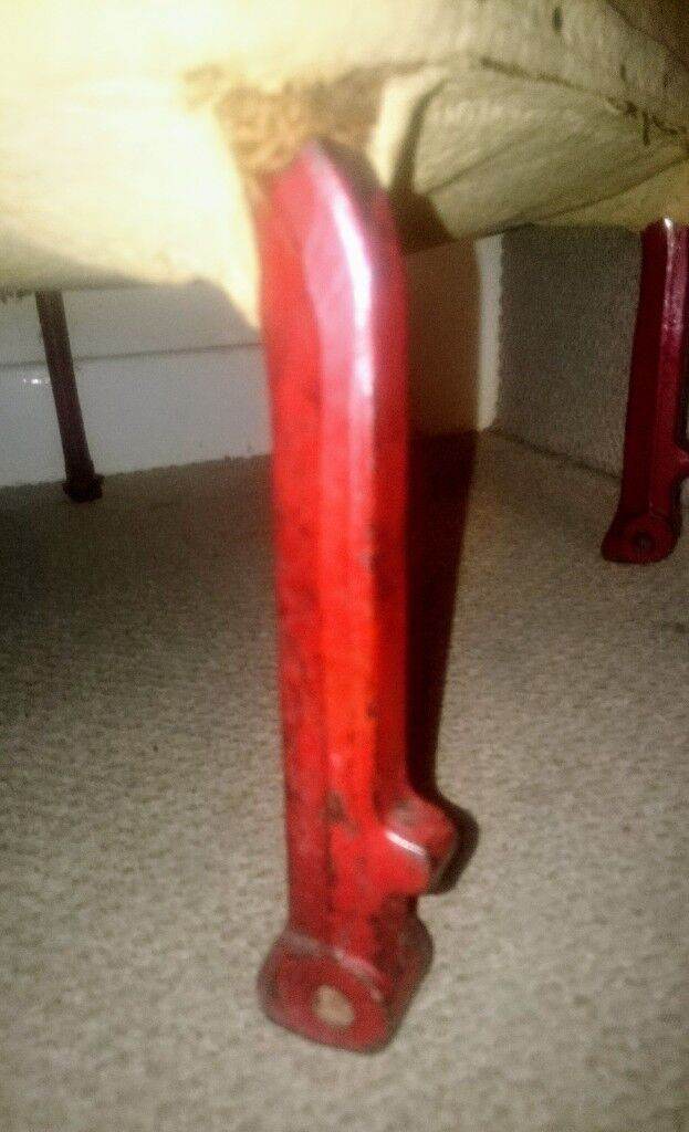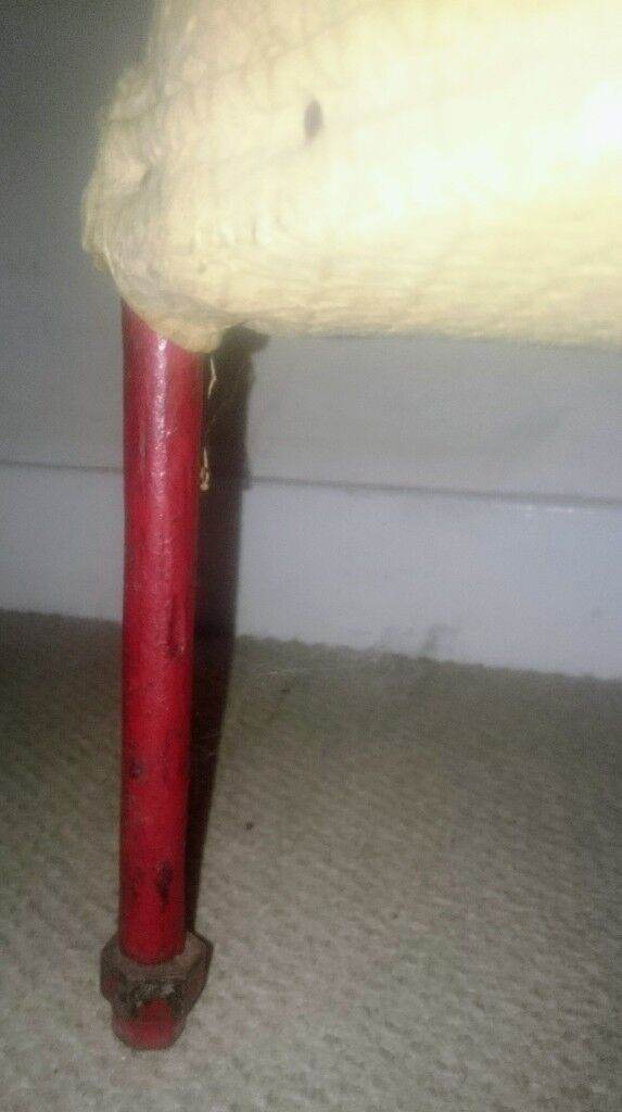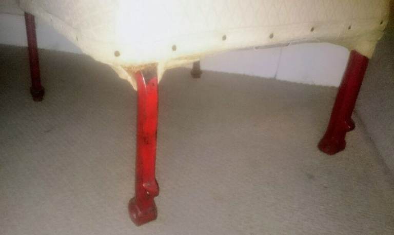 Original metal legs in red, which would have been bolted to the car floor. The chair is quite low and very springy/bouncy - I guess to help provide some comfort on bumpy roads before suspension technology improved.