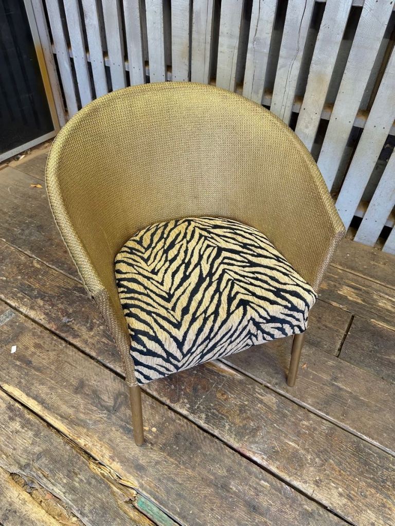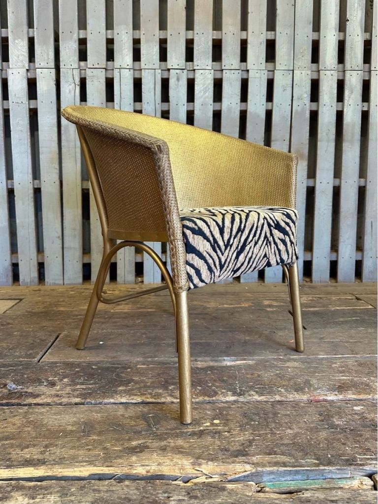 Fab cool looking 1960s Sirrom bedroom/ accent chair. It’s in the original gold and with contemporary blue leopard print material base . Very funky chair