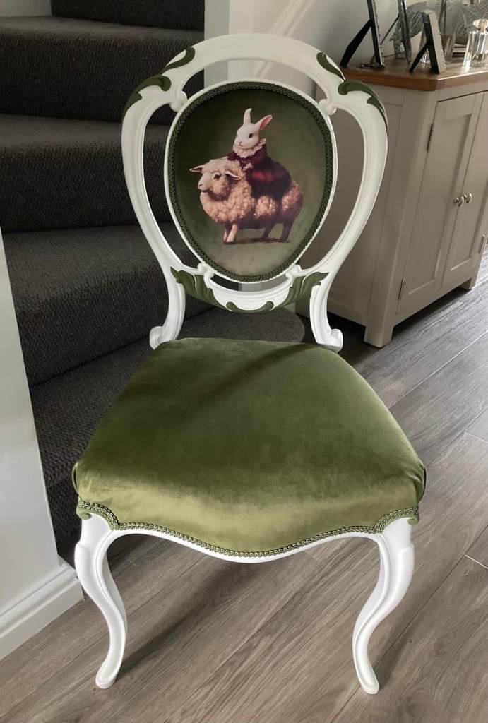 Wood sides with velour covered seat and backrest.
