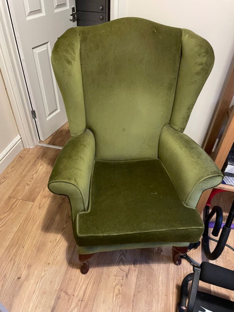 2 high wing back chairs. Green velvet material with wooden legs. Good condition with one slight mark on the back rest area of one chair shown in photograph. Sold as a pair.