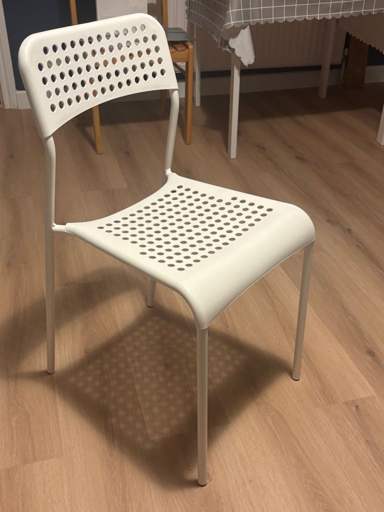 Set of 2 white perforated plastic chairs with metal legs, purchased from ikea.