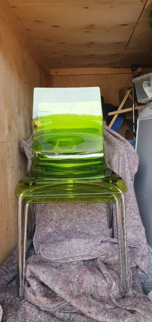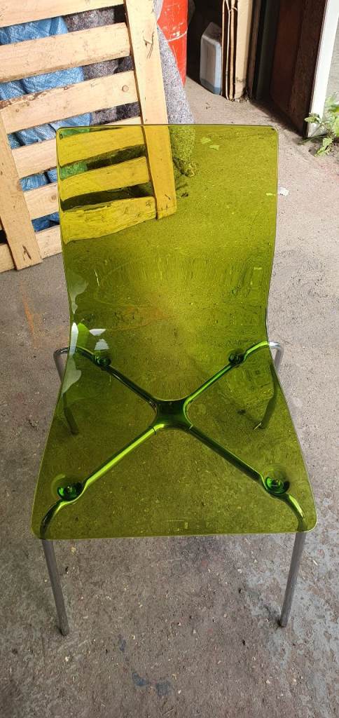 3x Italian Roberto Foschia Slim style dining chairs in transparent lime green perspex and chrome.