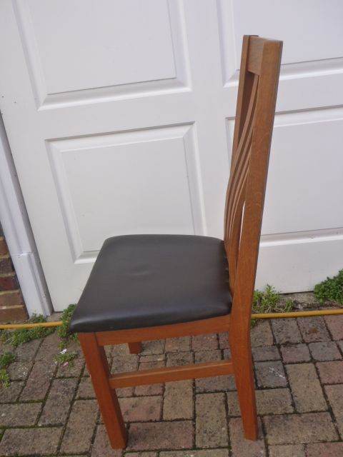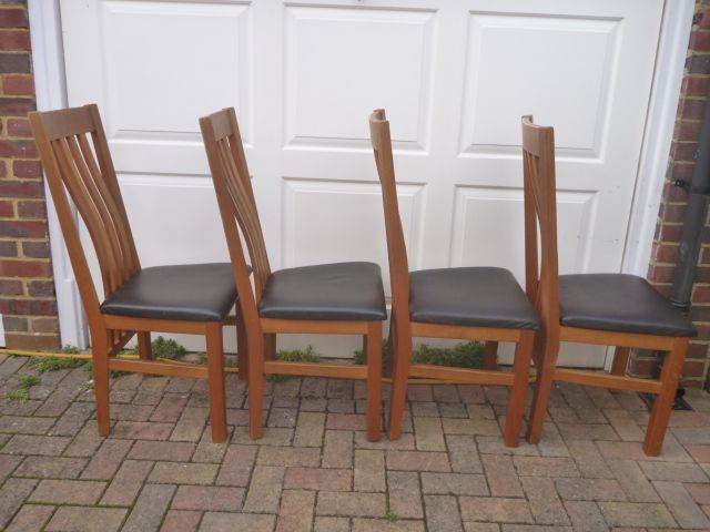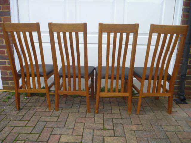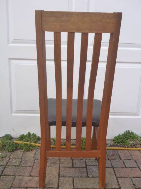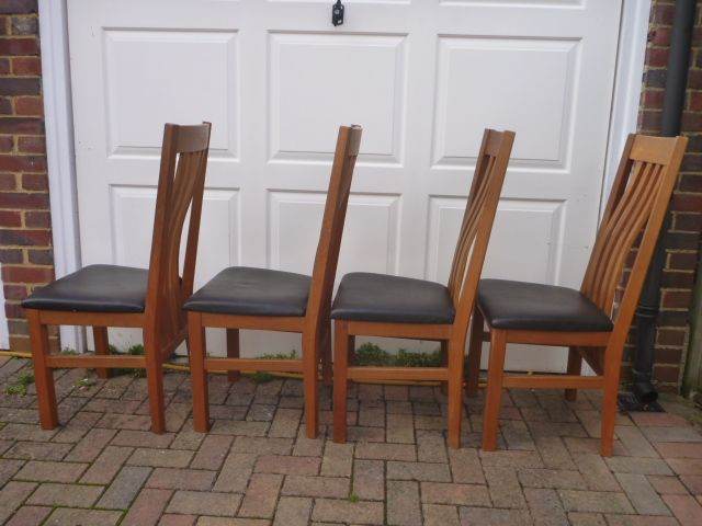 4 lovely solid oak framed high backed dining chairs in very good condition. They have nice curved backs and black upholstered seat pads in excellent condition. All stable, do not wobble and very comfortable to sit in. From a smoke free home