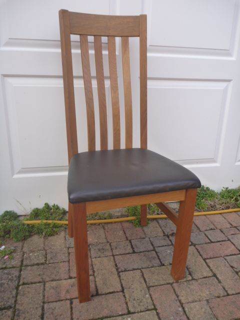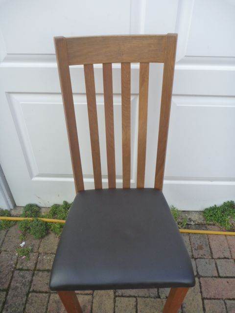 4 Solid Oak Dining Chairs with Black Leather Seat Pads in VGC