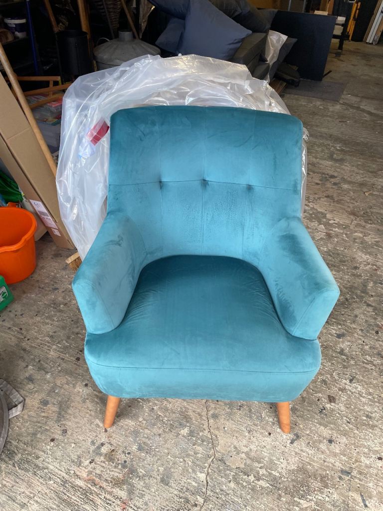 Teal velvet accent/armchair from Next with wooden legs. Excellent condition, used in kitchen diner and rarely used. Height 82 cm Width 61cm Depth 70cm