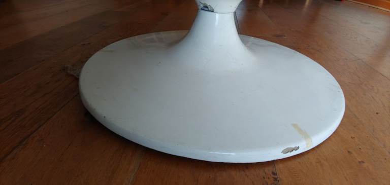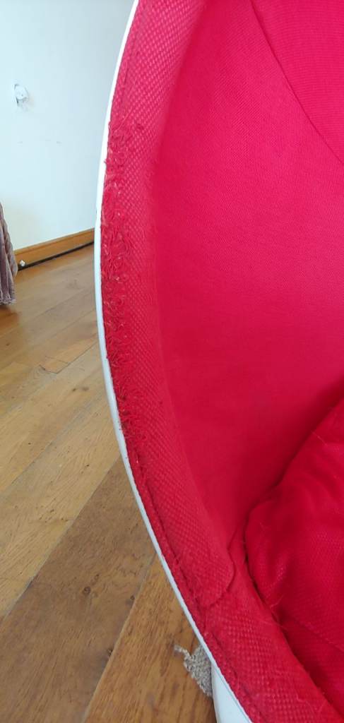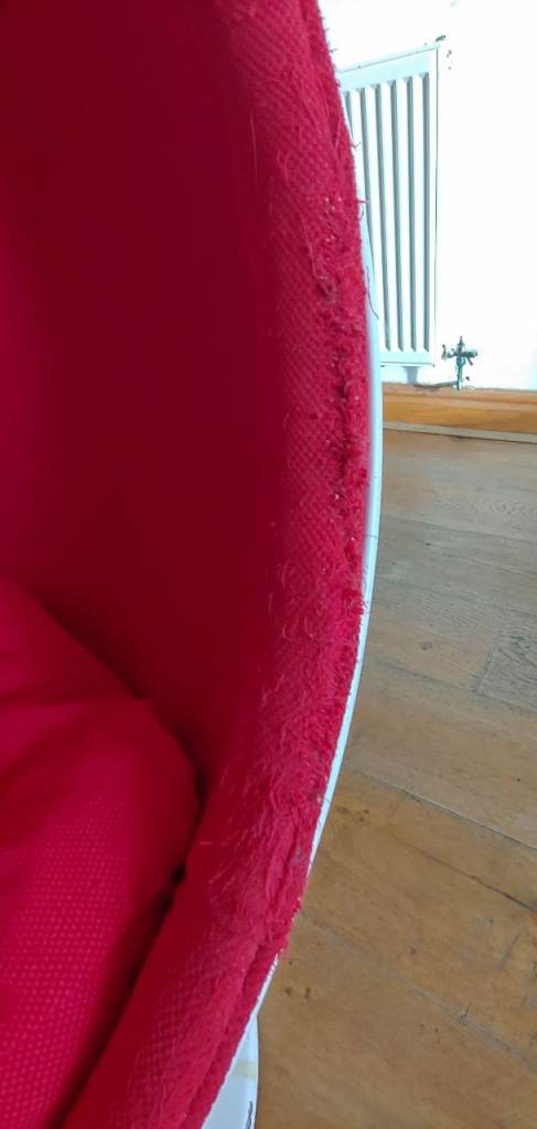 Some wear and tear, including marks/chips on the base(in photos) and scratches on outer shell, and some scratching/fraying on the fabric edge inside (also in photos).