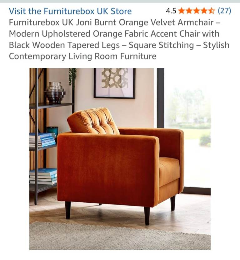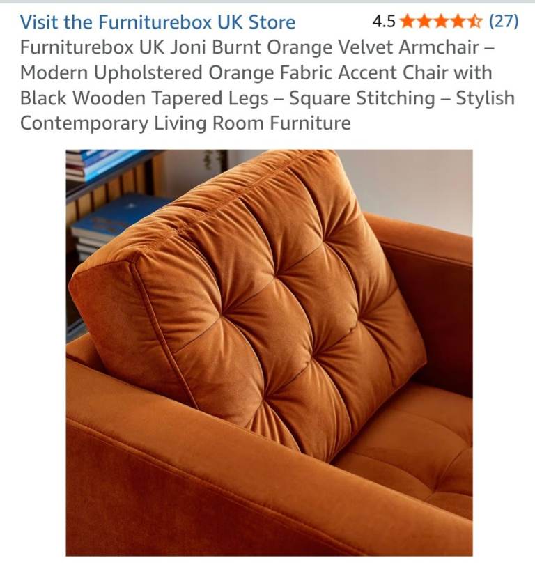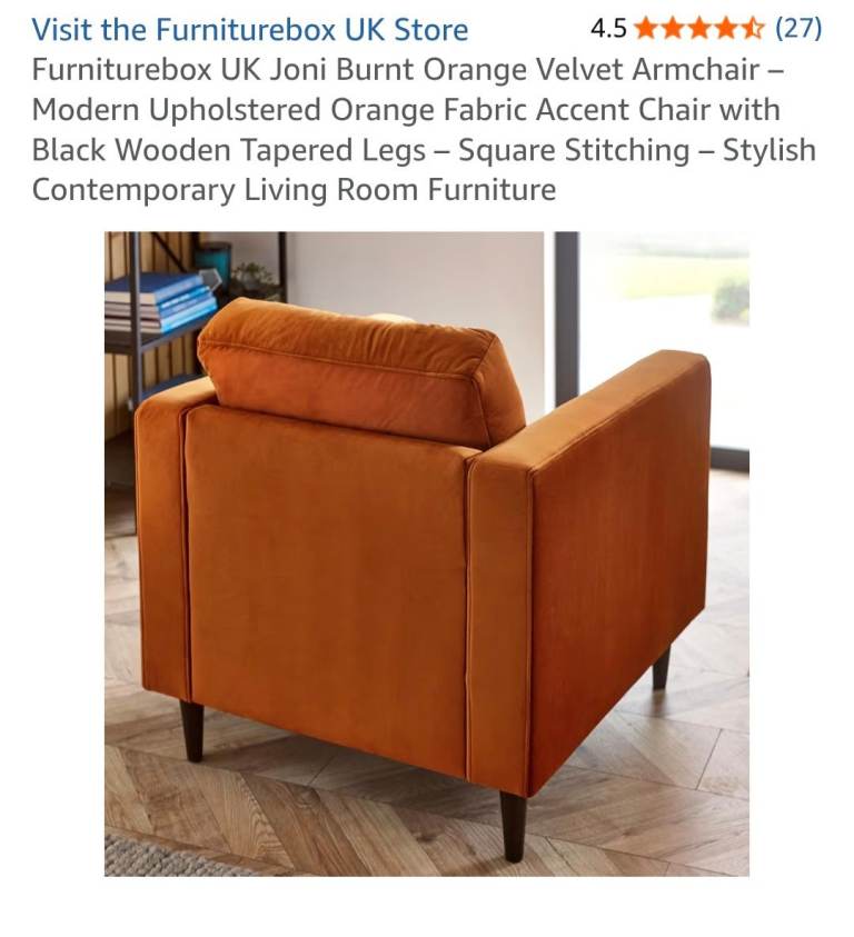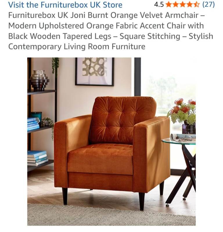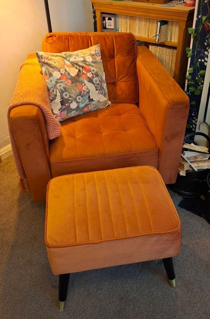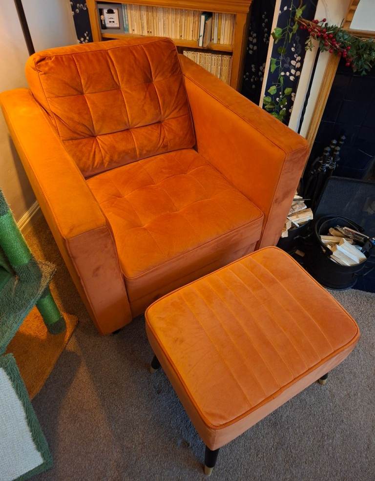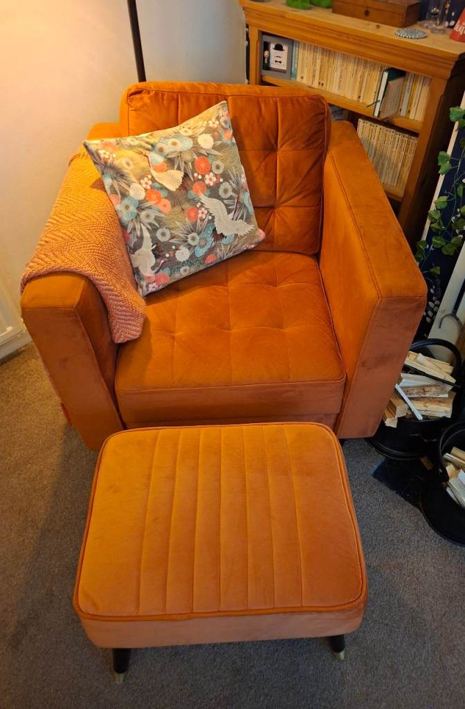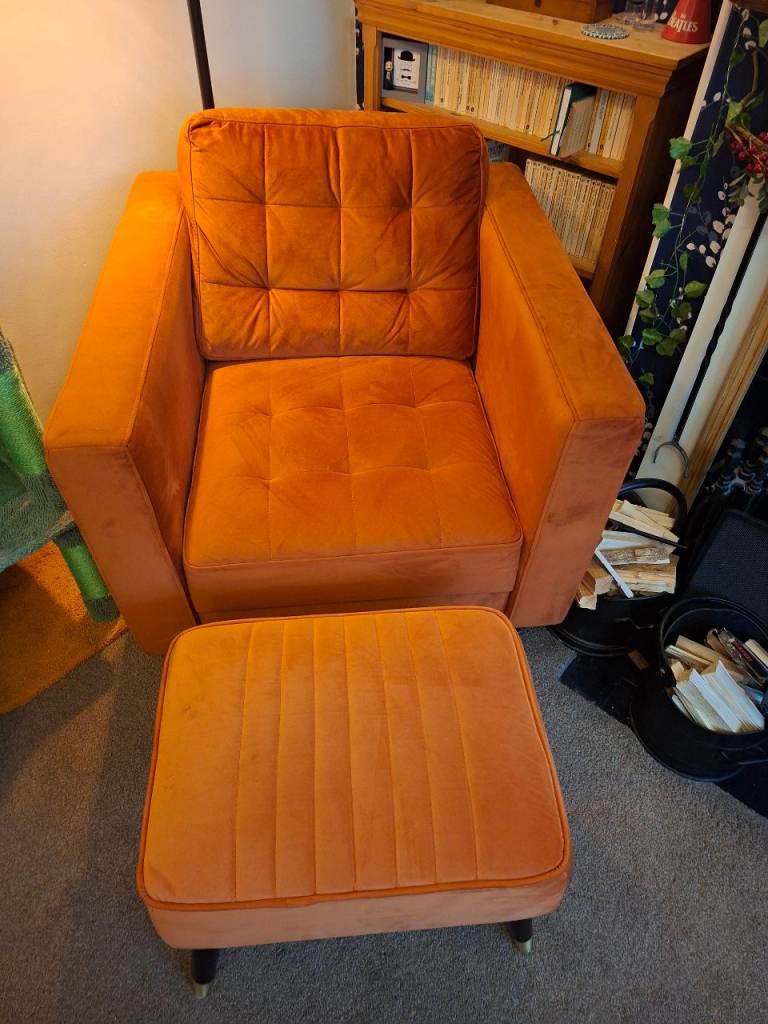 Beautiful Orange Velvet Chair & Footstool. Bought less than a year ago for £400. Only selling as changing living room seating. Buyer to collect from St Thomas, Exeter. Unable to deliver.