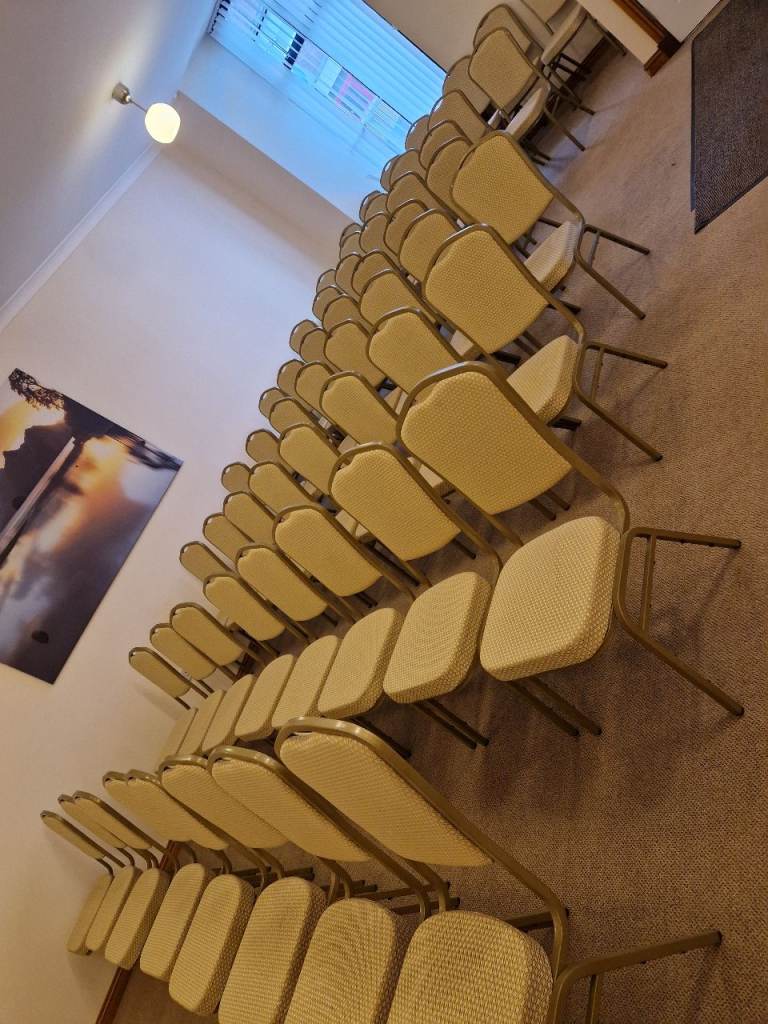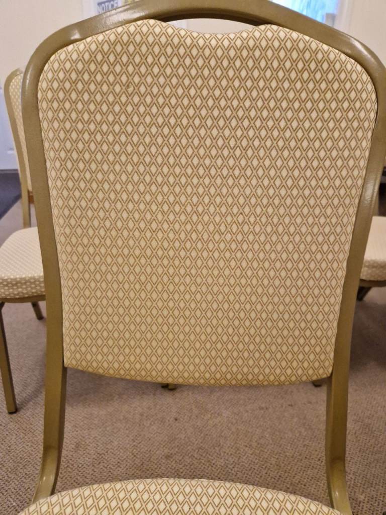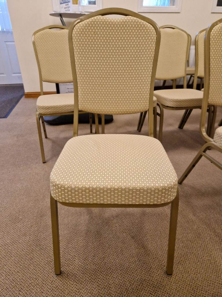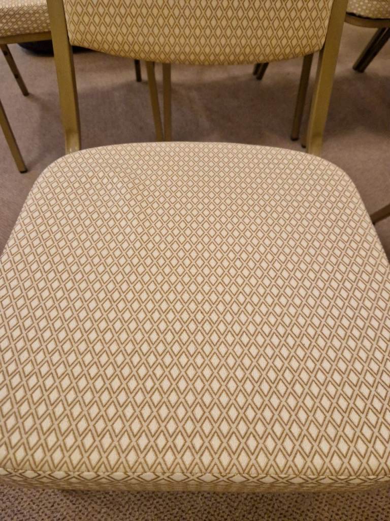 Posting for 11+ monthsBeige Dining Stackable Chairs with Padded Fabric - Indoor Use Ideal for Restaurants, Events