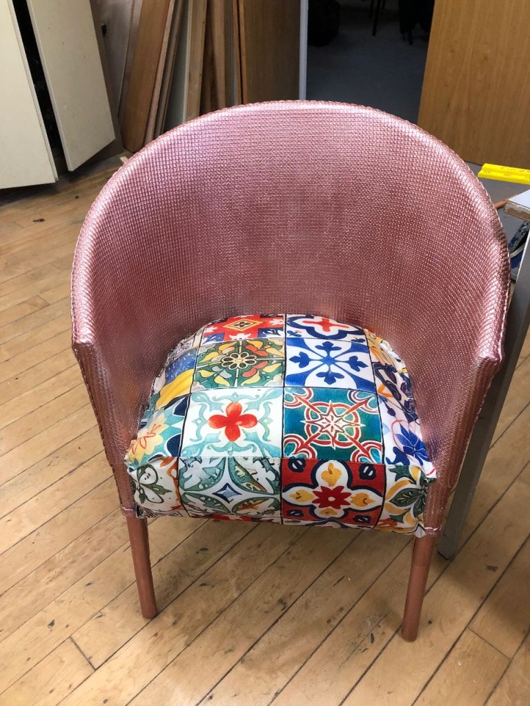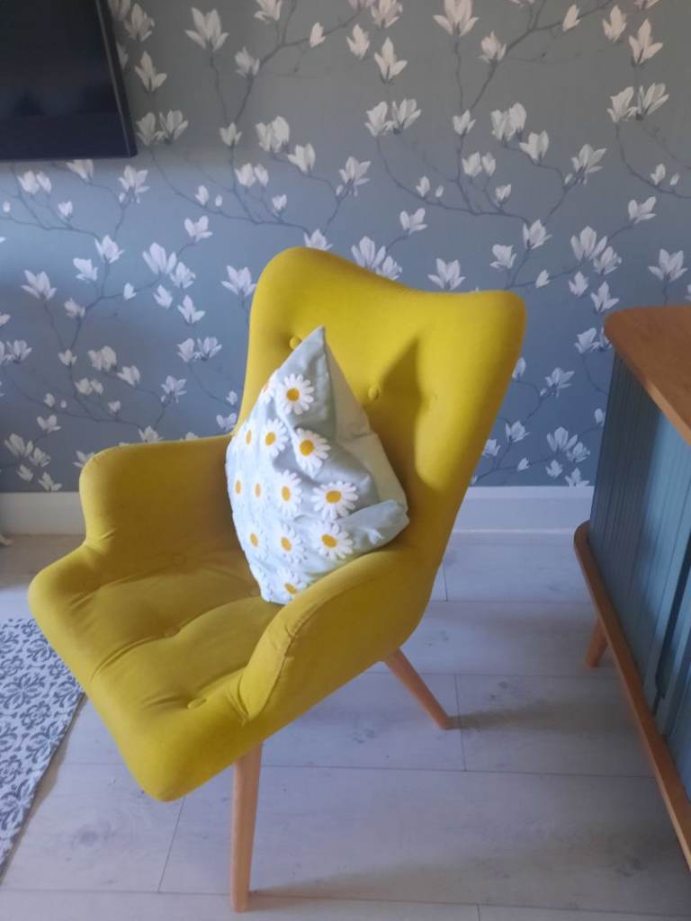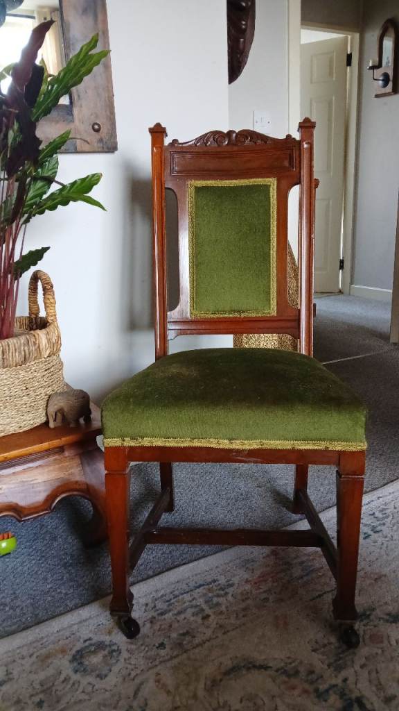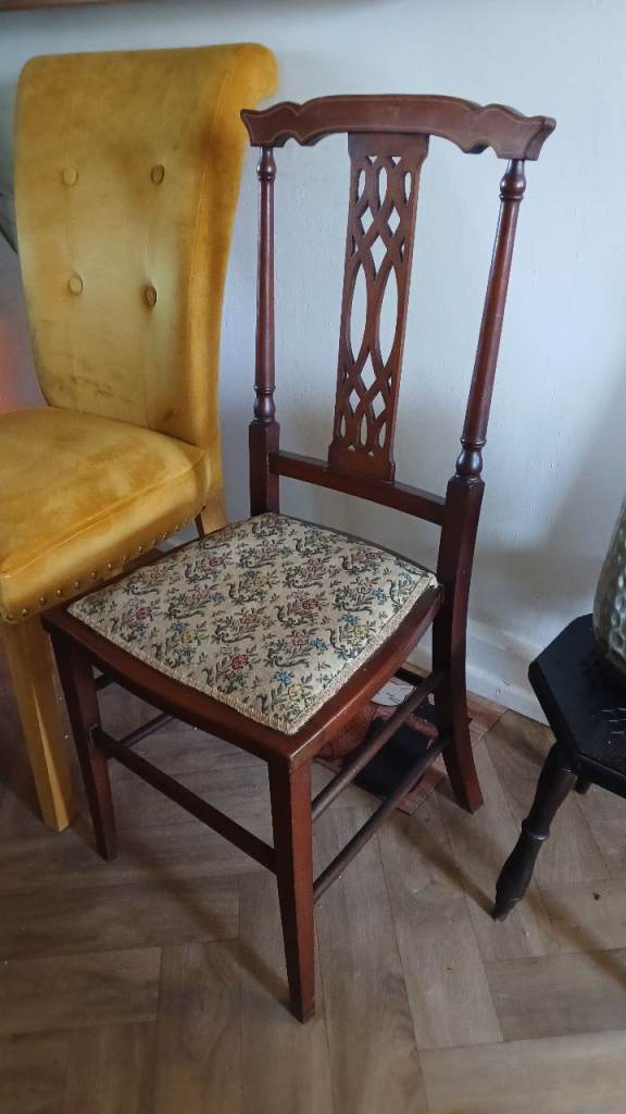 Black wooden chair. Lovely design. Removable seat pad easy to recover to suit any room. Some scratches on wooden frame and can be repainted easily.
