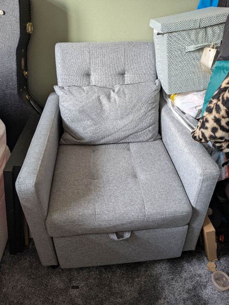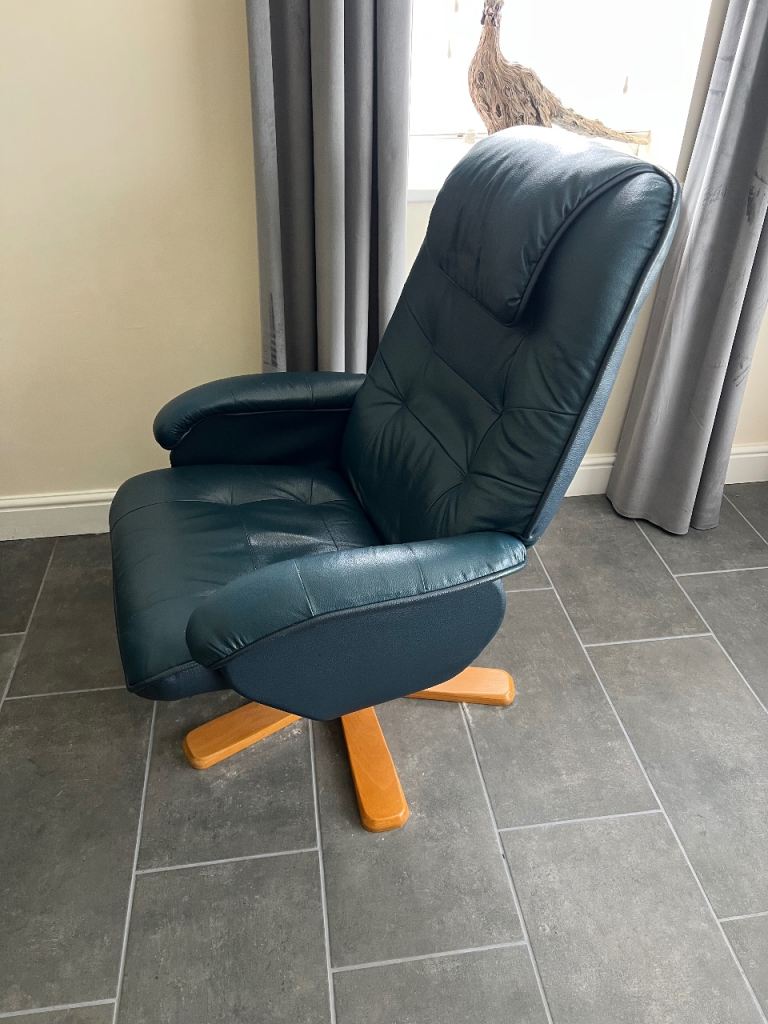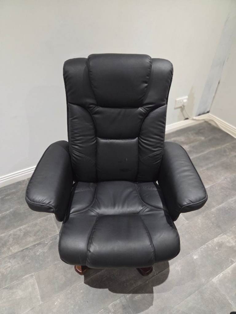 This is a black recliner chair and footstool. The item is is good condition with a few little marks but no rips or tears.