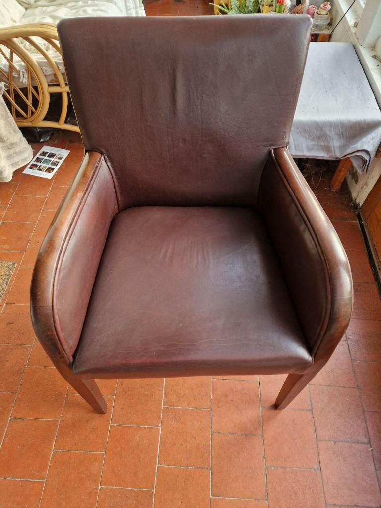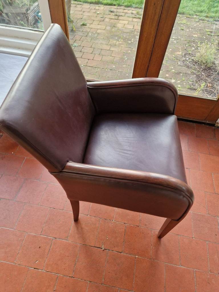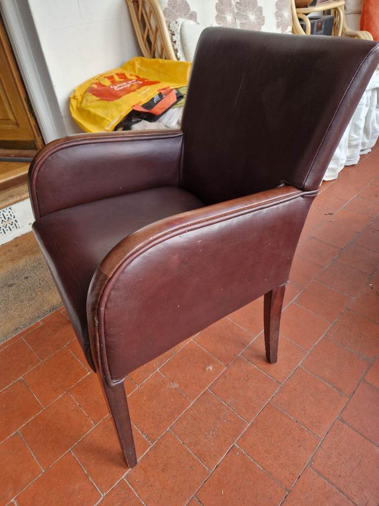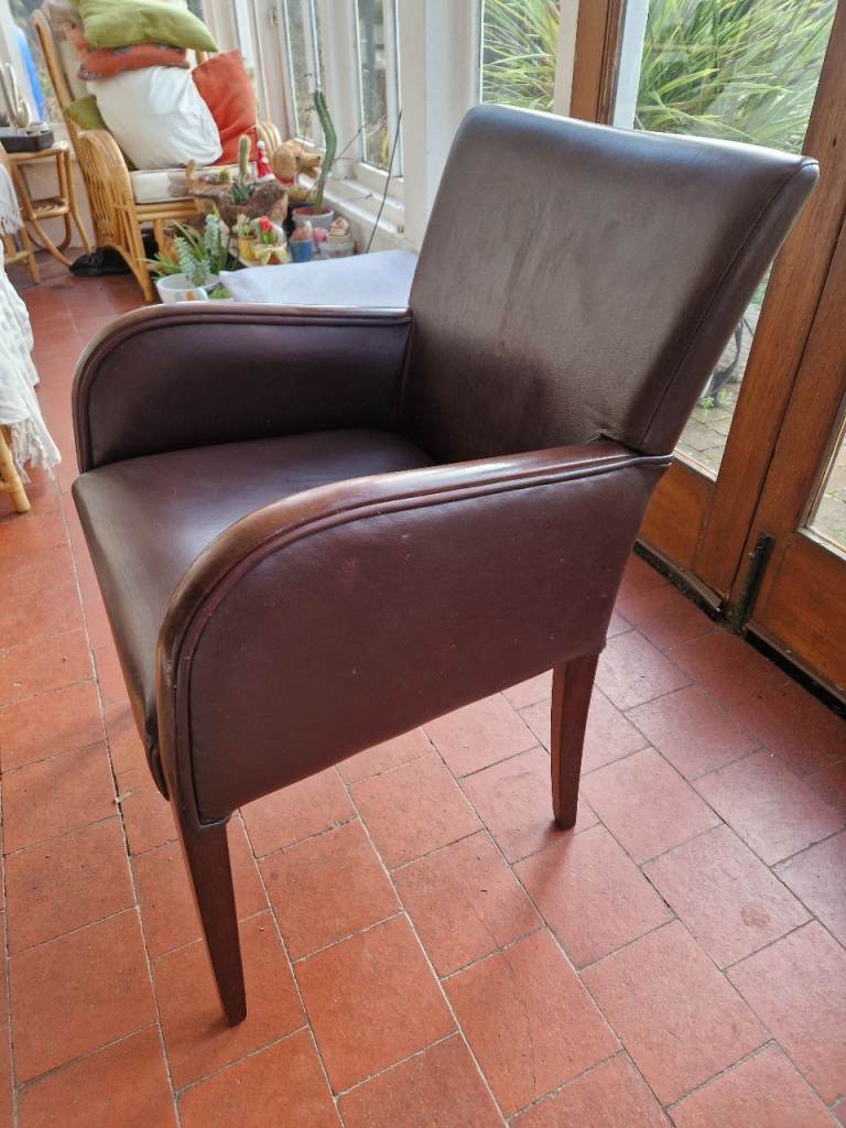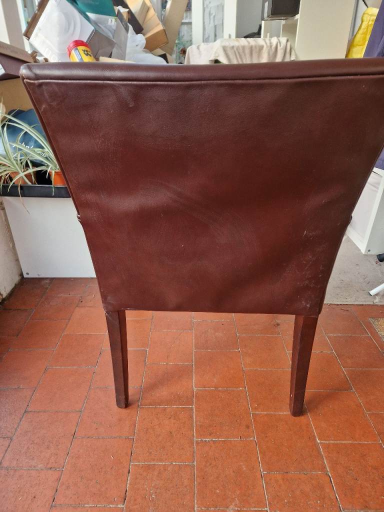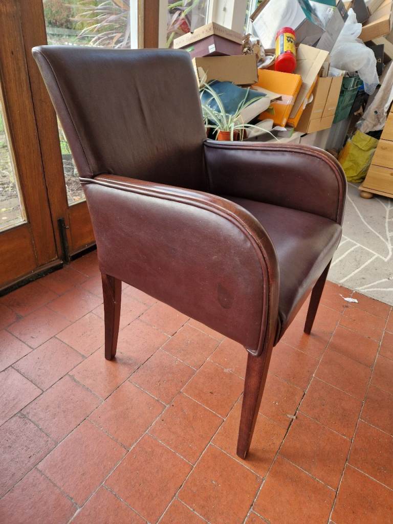 Brown faux leather chair with wood arm cappings. Nice and comfy...but now surplus to needs. Hoping for a good home...