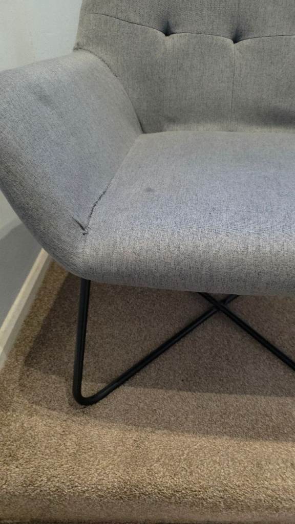 The chair is still solid and comfortable, but it would suit someone who doesn’t mind cosmetic damage, wants a project, or plans to use a throw/cover.