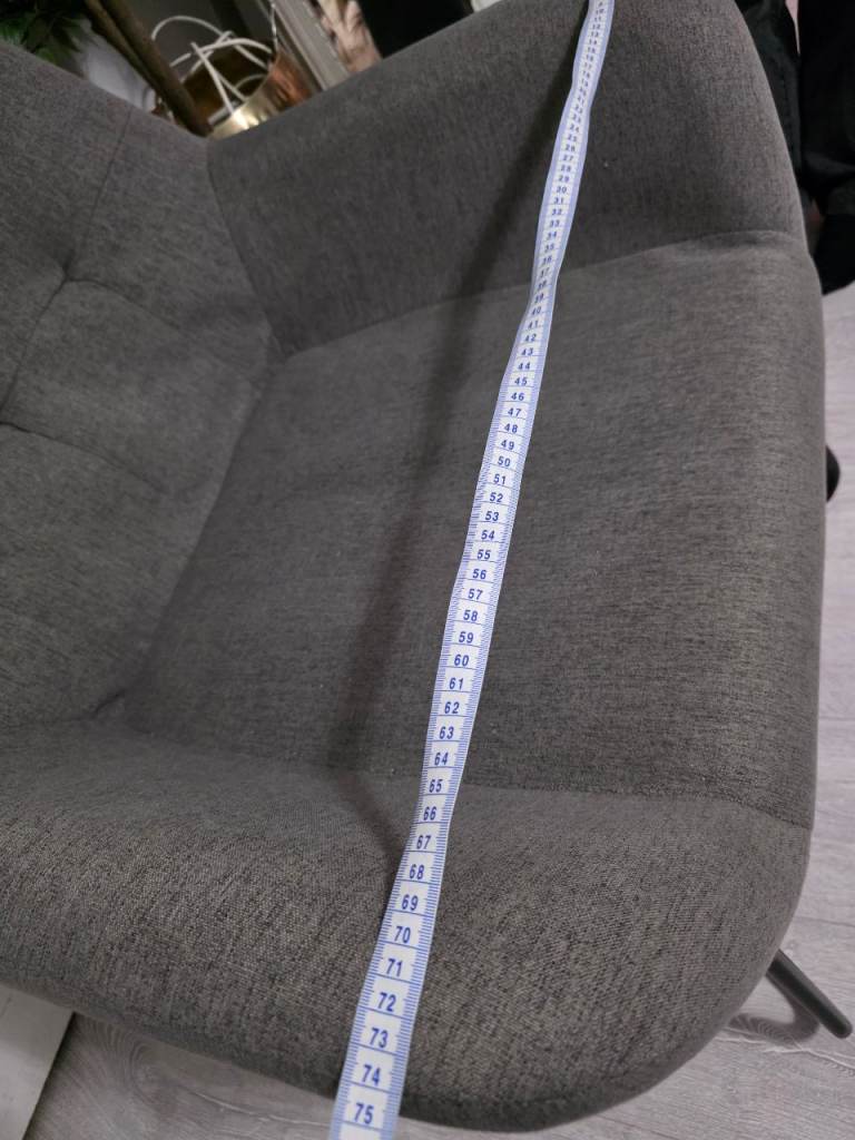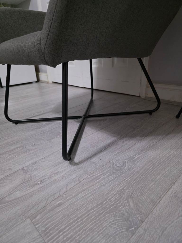 Comfortable grey fabric accent chair with black metal legs. Modern style, sturdy frame, and still very usable.