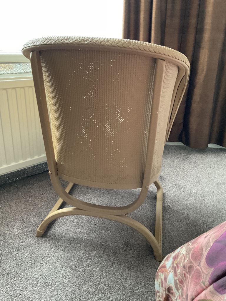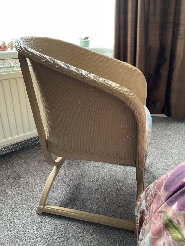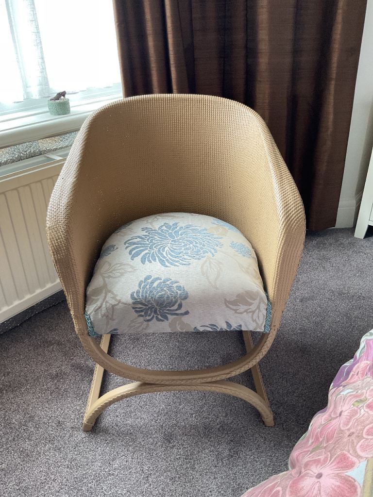 Lloyd loom style chair as seen in photos. Comfortable padded seat in blue and brown.