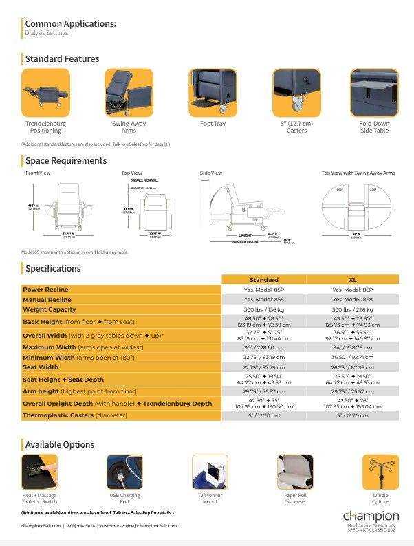 Champian The Classic Manual XL healthcare dialysis recliner chair