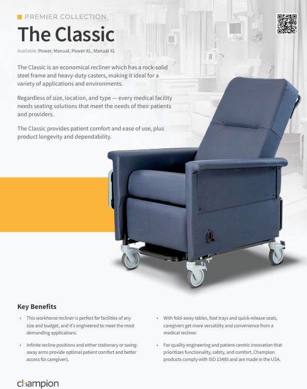 The Classic provides patient comfort and ease of use, plus product longevity and dependability. This workhorse recliner is perfect for facilities of any size and budget, and it’s engineered to meet the most demanding applications.