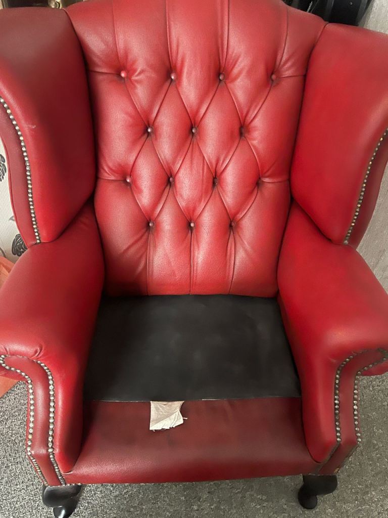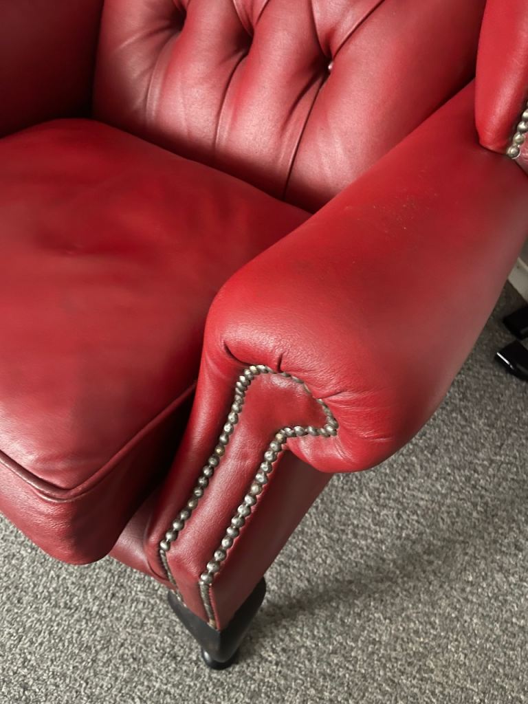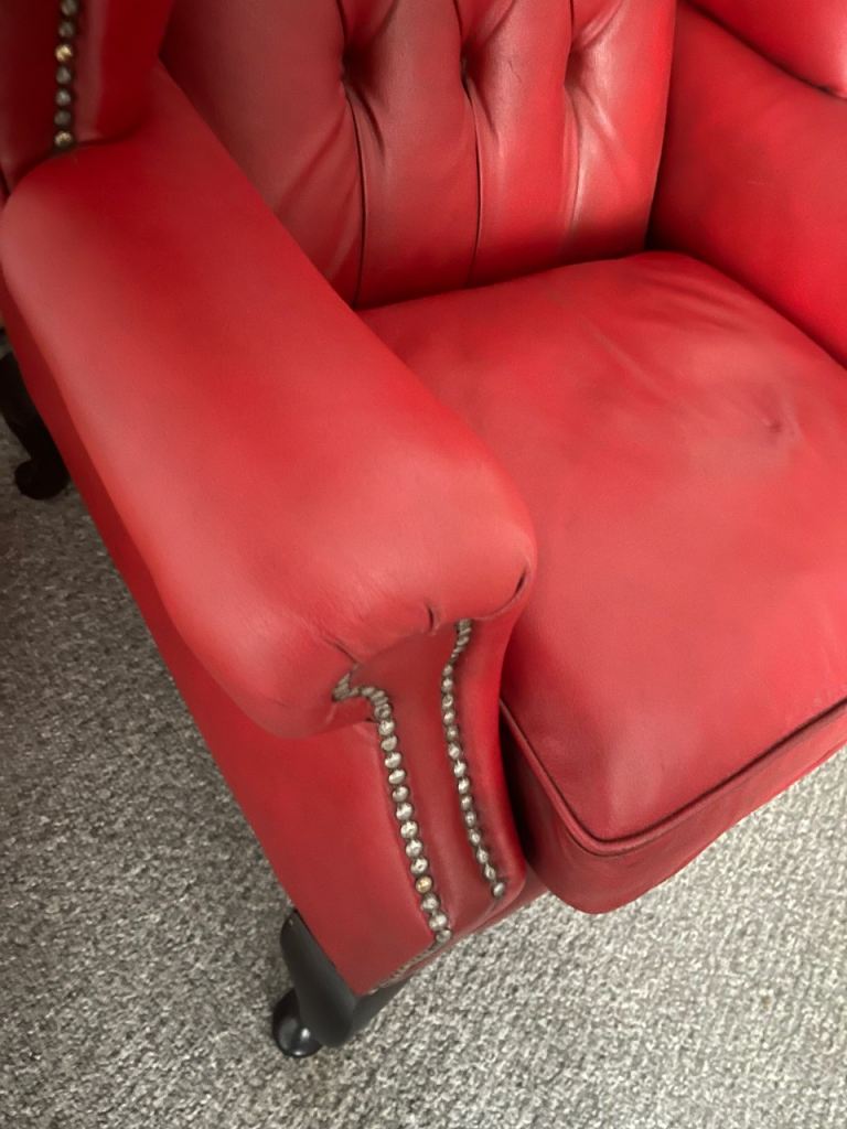 Beautiful large red chair can be a fireside chair too. Leather in superb condition: