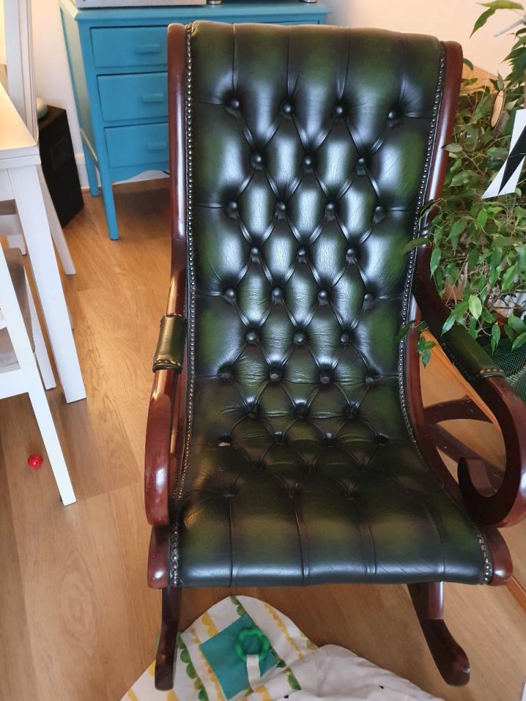 Chesterfield-Style Green Leather Rocking Chair – Solid Wood Frame